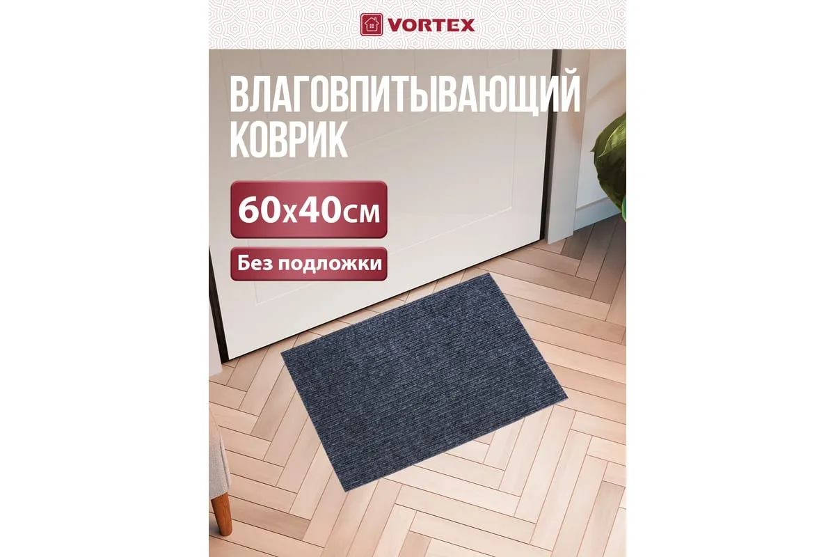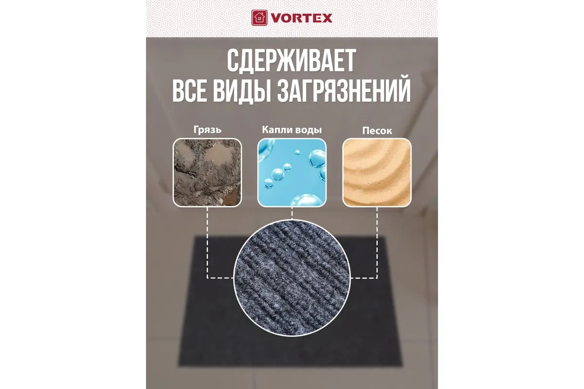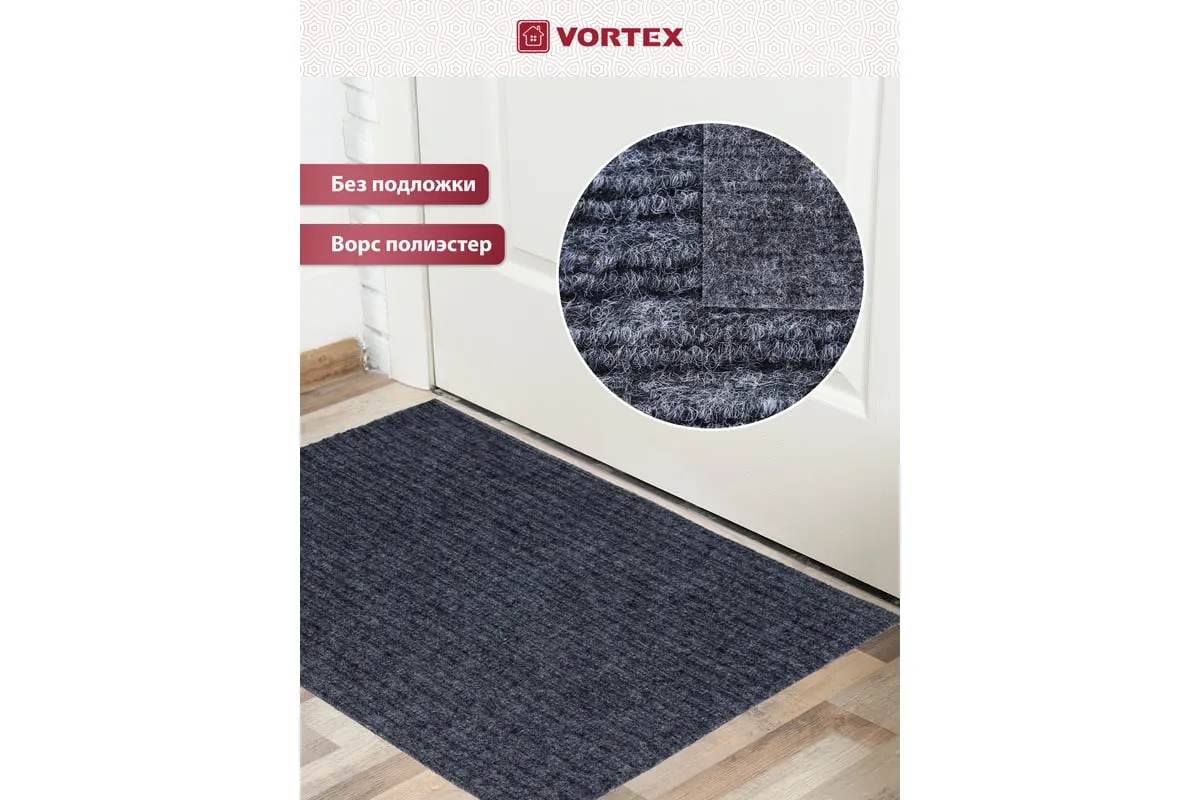 Коврик очищает обувь от грязи и задерживает влагу при входе в помещение. Без подложки.