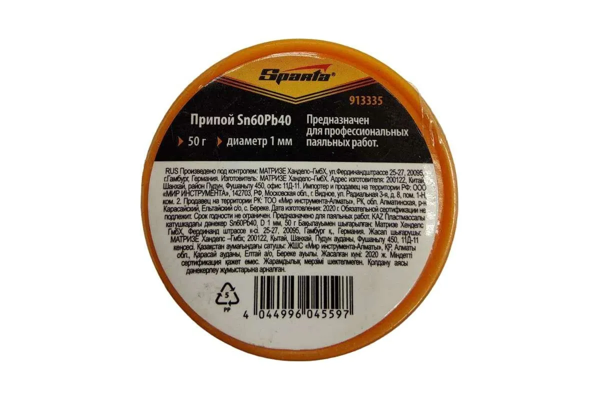 Припой Sn60Pb40 Sparta 913335 диаметром 1 мм, 50 г, на пластмассовой катушке, применяется для паяльных работ. Легкоплавкий припой надежно соединяет детали из меди и нержавеющей стали. Его используют во время монтажа или ремонта радиоэлектронной аппаратуры.