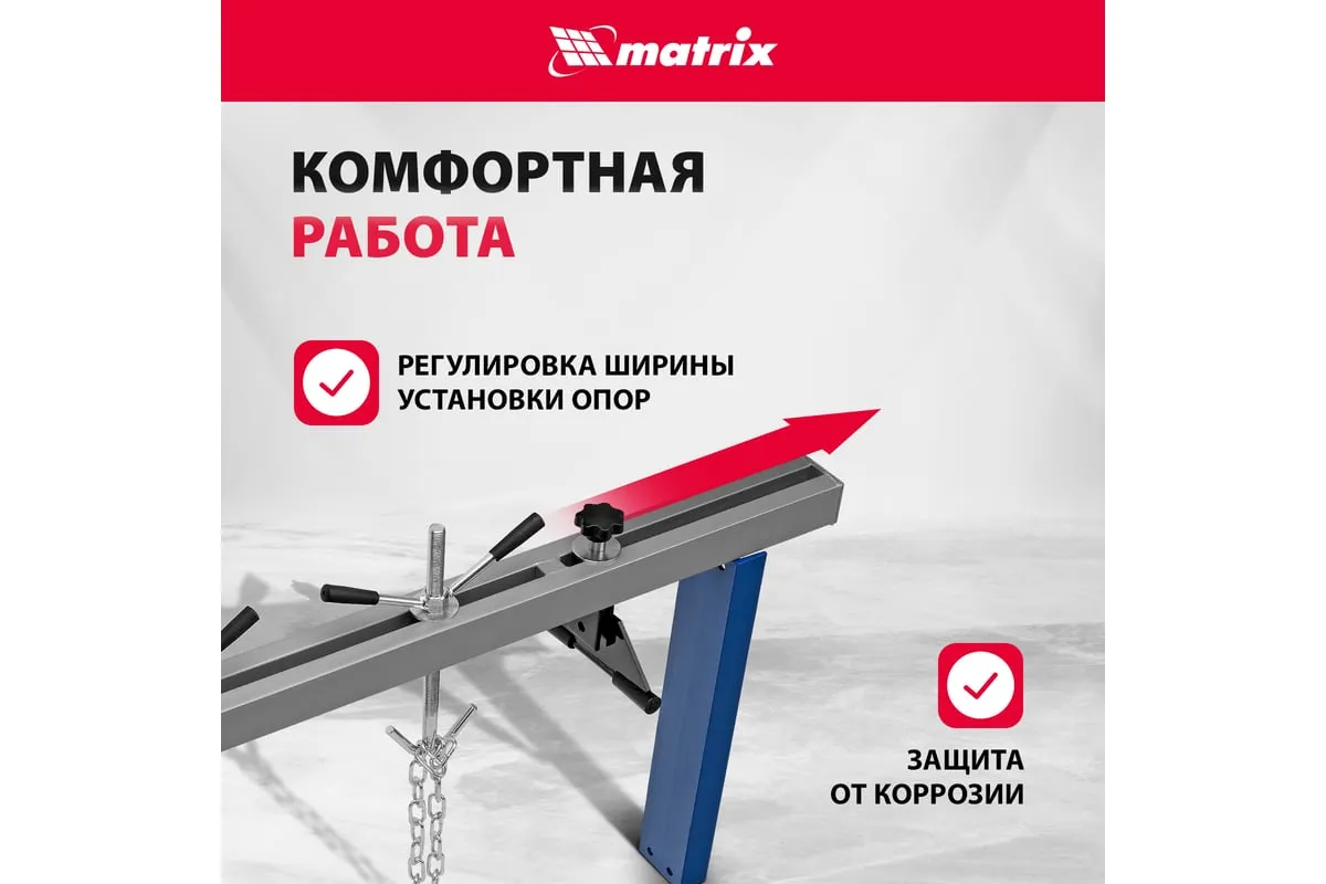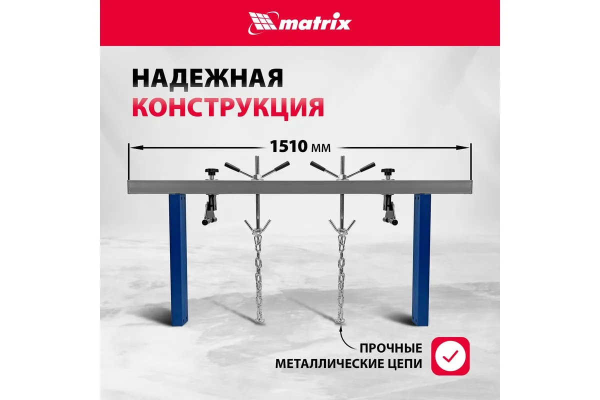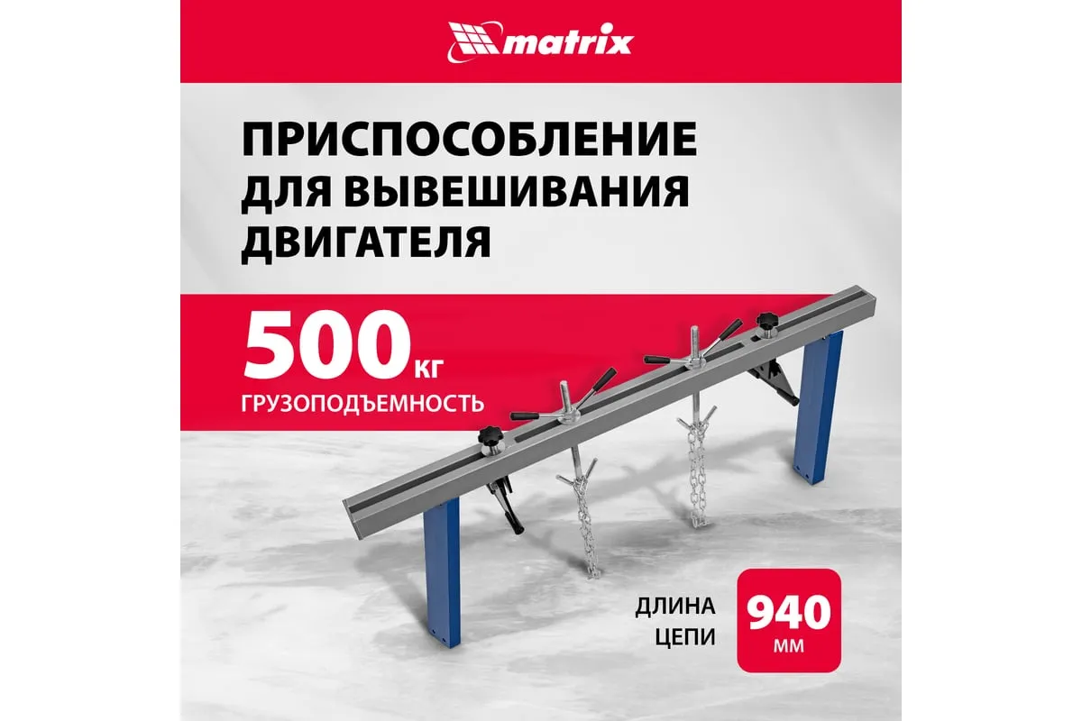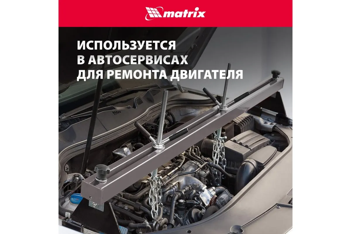 Приспособление для вывешивания двигателя MATRIX 500 кг 567895 - профессиональное устройство, которое используется для вывешивания двигателя в моторном отсеке автомобиля при проведении ремонтных работ. Две прочные цепи оснащены специальными фиксаторами, за которые крепится двигатель. Отличительно особенностью является возможность подвешивания одновременно двух грузов. Конструкция защищена от образования коррозии.