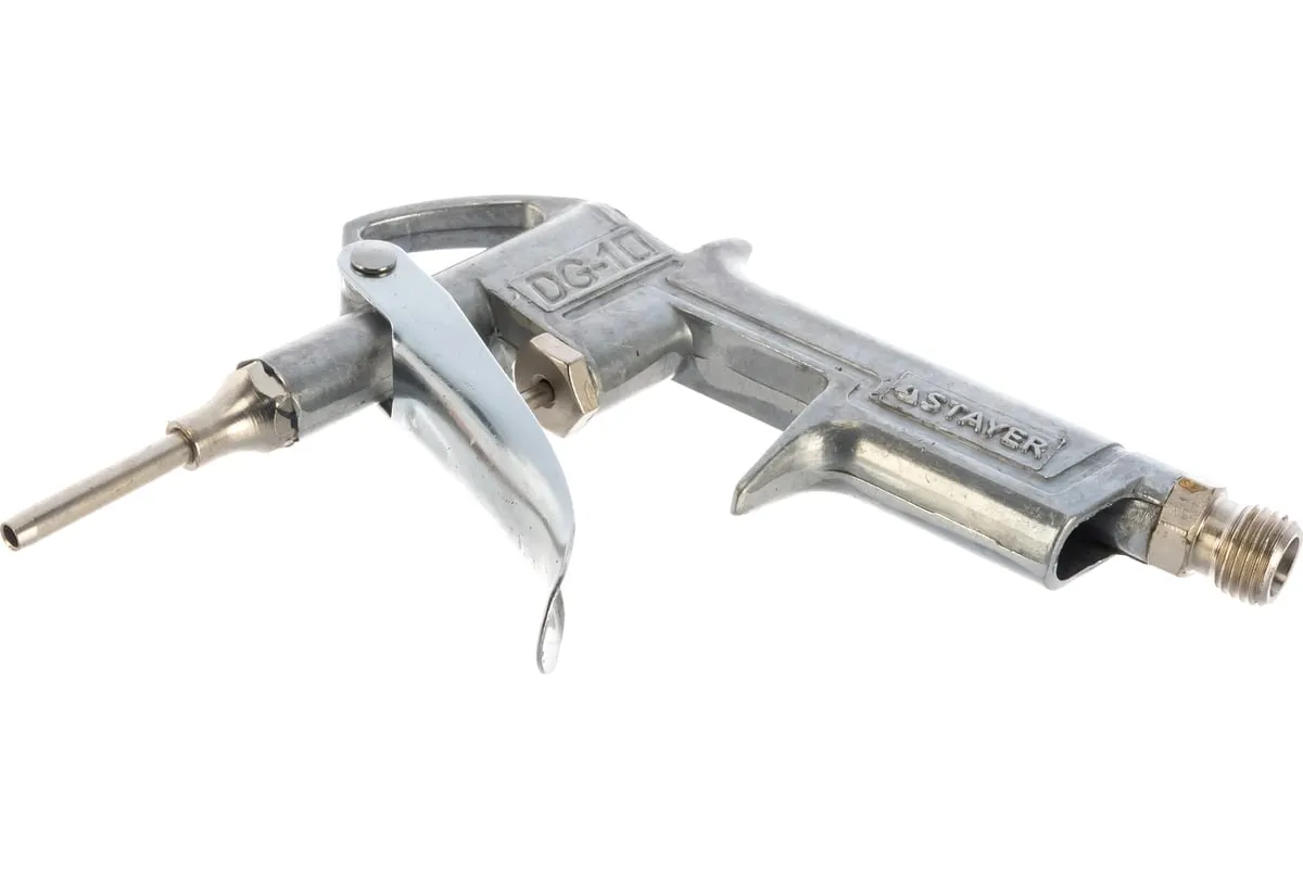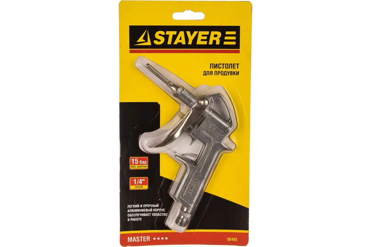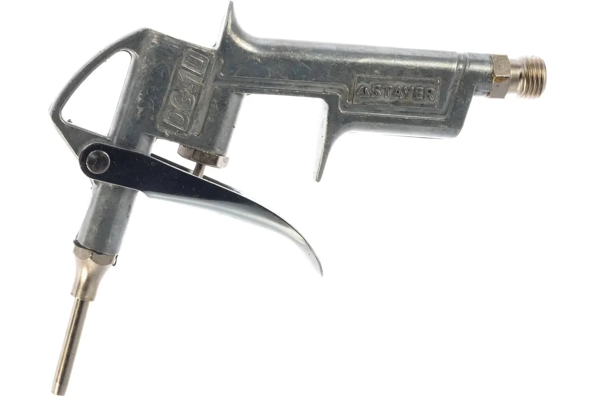 Продувочный пистолет STAYER MASTER 06485 предназначен для продувки и очистки поверхностей от загрязнений сжатым воздухом. Модель подключается к пнемосети и компрессору через резьбовое соединение размером 1/4" Удлиненное сопло обеспечивает удобство пользования в узких отверстиях и прочих труднодоступных местах.