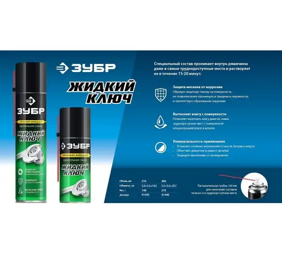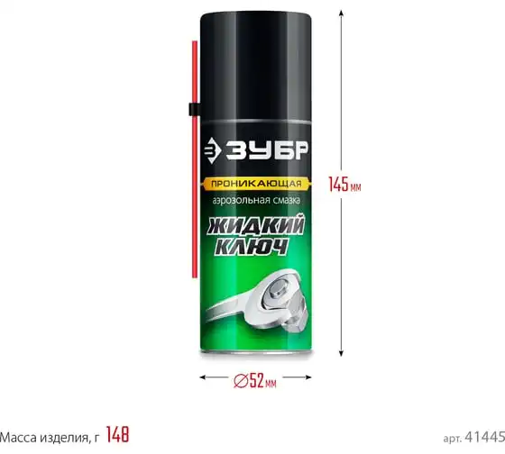 Проникающая смазка ЗУБР 41445, предназначена для упрощения отвинчивания заржавевших резьбовых соединений, смазывания трущихся поверхностей, удаления скрипов и заедания деталей. Состав активно проникает в пористую рыхлую структуру ржавчины и накипи и размягчает ее в течении 15-20 минут. После этого соединение с легкостью можно разъединить. Также защищает металл от коррозии и вытесняет влагу с поверхности, проникает в самые труднодоступные места. Помимо этого обладает свойствами обычной смазки, и применяется многофункционально.