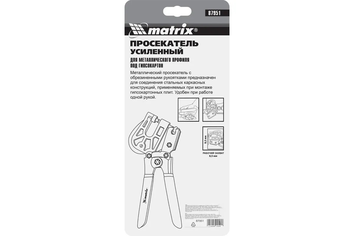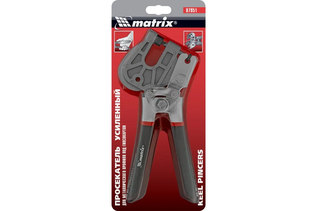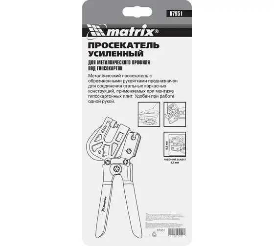 Просекатель Matrix 87951 предназначен для надежного соединения металлических профилей под гипсокартон и оснащен уникальным рычажным механизмом, облегчающим работу одной рукой. Просекатель используется для создания перегородок и монтажа каркаса под подвесные потолки.