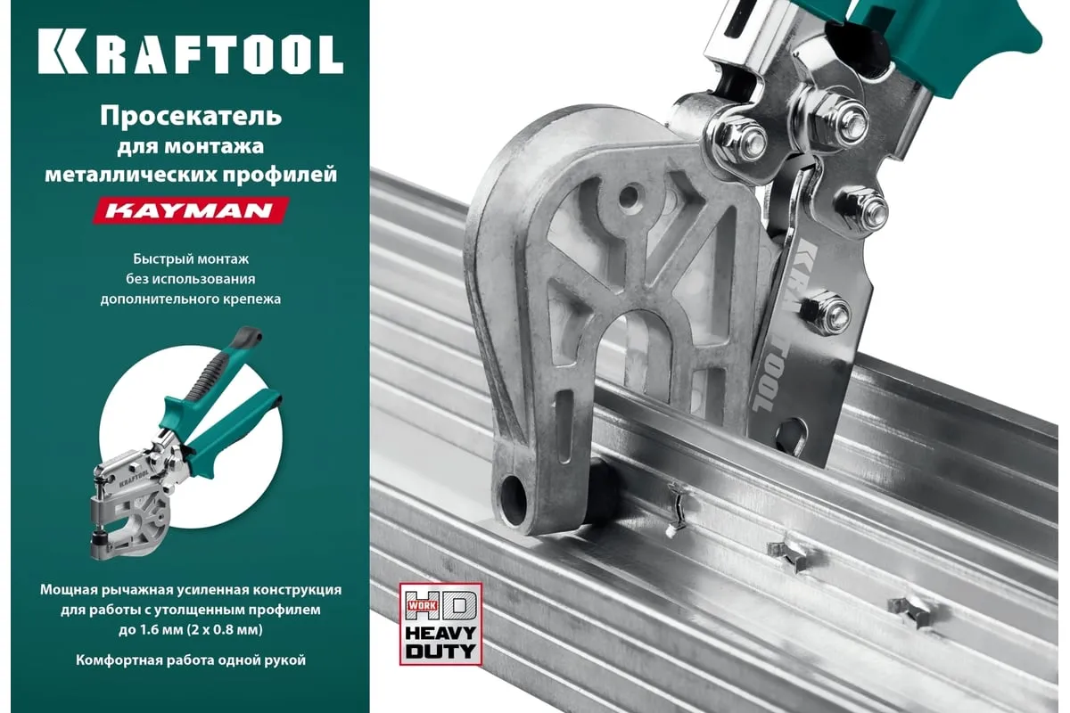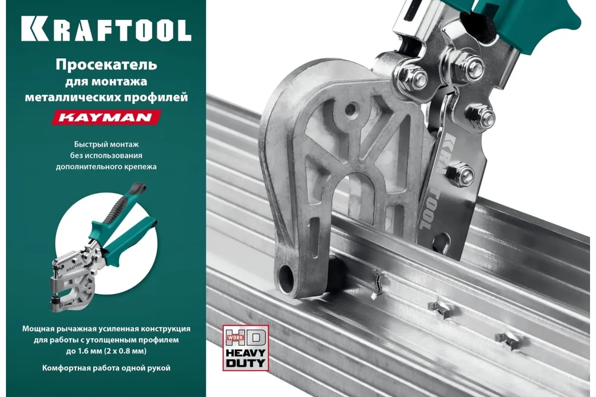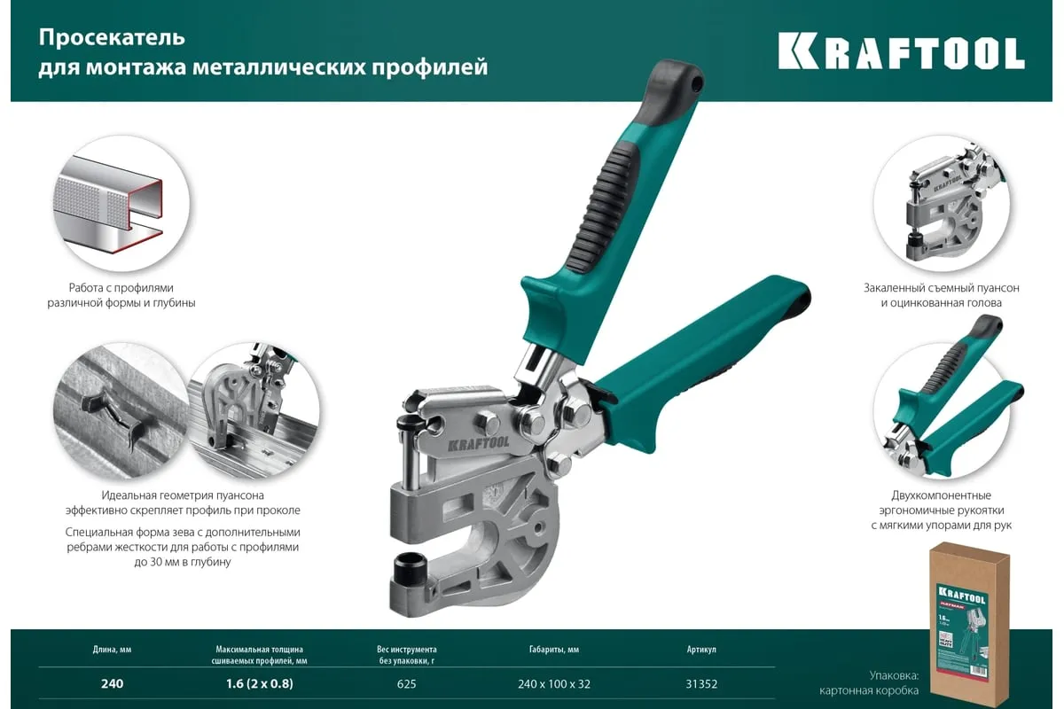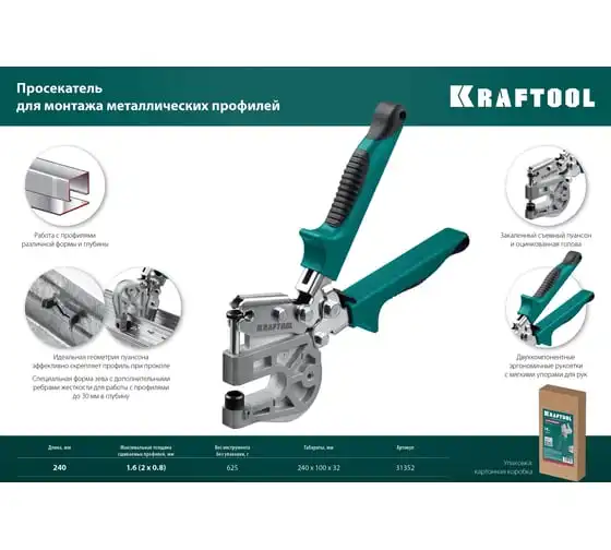 Просекатель для монтажа металлических профилей KRAFTOOL Kayman31352 надежный инструмент, обладающий сильной пробивной способностью. Соединяет между собой металлические профили в любом положении и под любым углом. Максимальная толщина сшиваемых профилей: 1,6 (2 х 0,8) мм. Предназначен для быстрого крепления металлических профилей без использования заклёпок. Инструмент позволяет добиться прочного обжимного соединения. Компактные размеры просекателя позволяют держать инструмент одной рукой, а второй придерживать металлопрофиль, т.е. возможно выполнять работы в труднодоступных местах. Усиленная конструкция двухкомпонентной рукоятки с мягкими упорами для рук позволяет инструменту не скользить в руке.