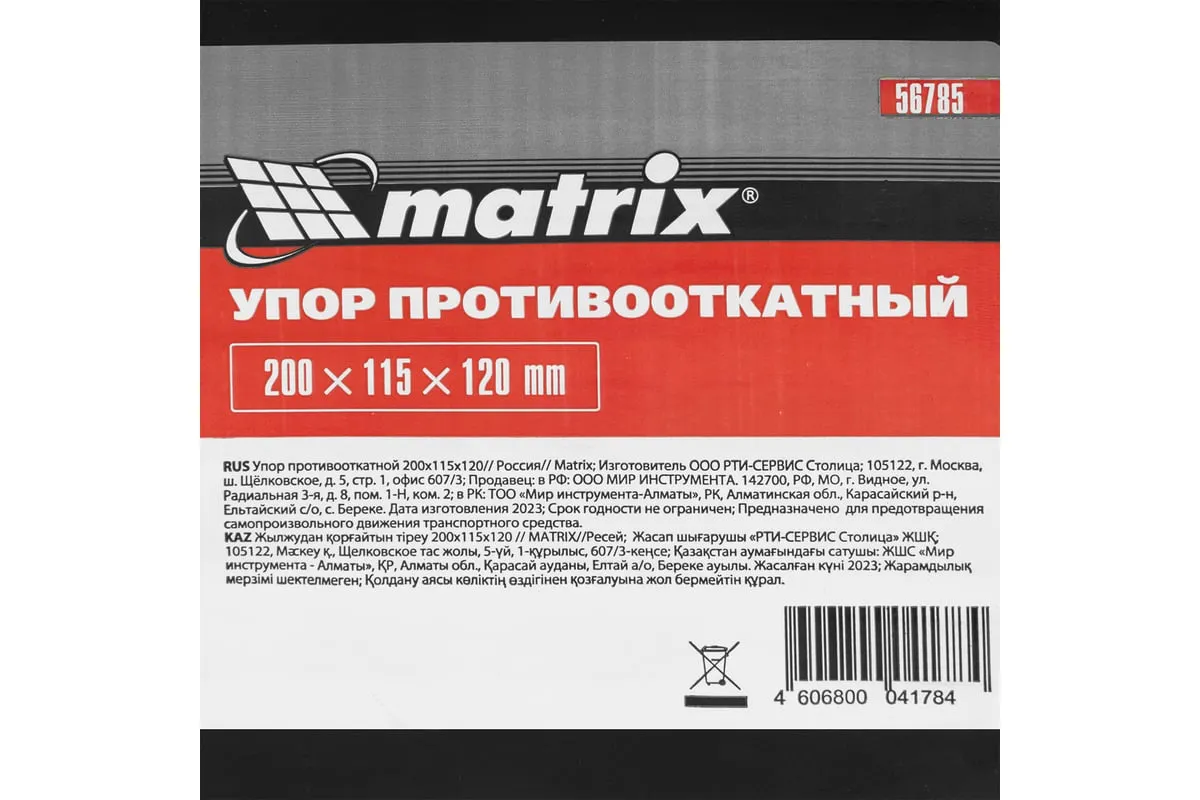 Противооткатной упор Matrix 56785 размером 200 х 115 х 120 мм не дает легковому автомобилю или прицепу скатываться при остановке на наклонной или неровной поверхности. Упор, или башмак, необходим также в случае подъема автомобиля на домкрате для ремонта или замены колеса. Он пригодится в дороге, а также будет полезен в гараже и на станции СТО.