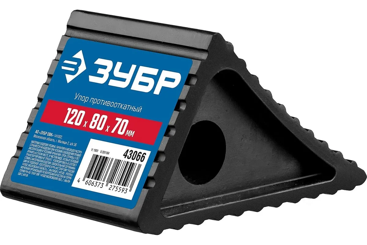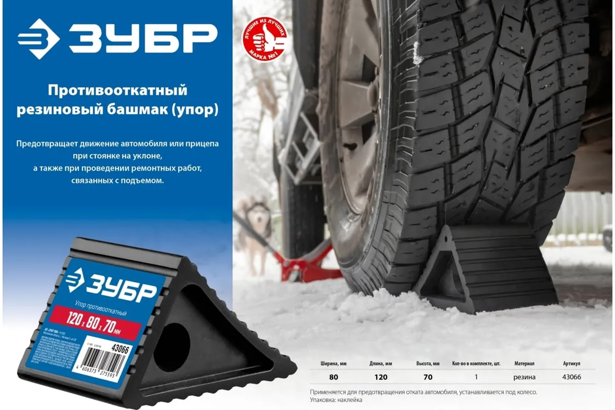 Противооткатный резиновый башмак (упор) ЗУБР 43066 предотвращает движение автомобиля или прицепа при стоянке на уклоне, а также при проведение ремонтных работ, связанных с подъемом ТС.
