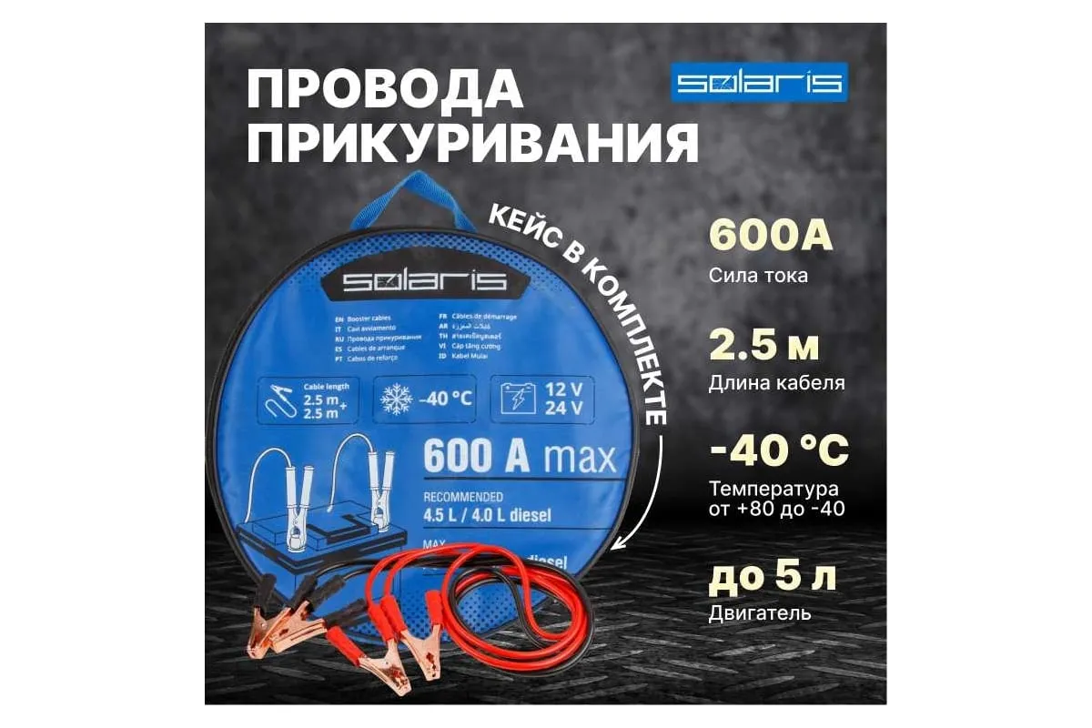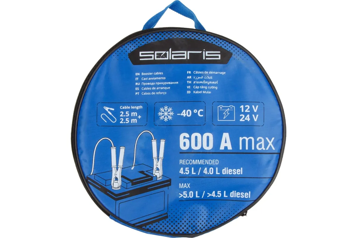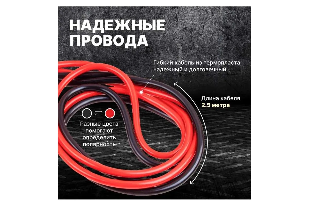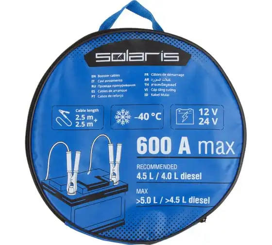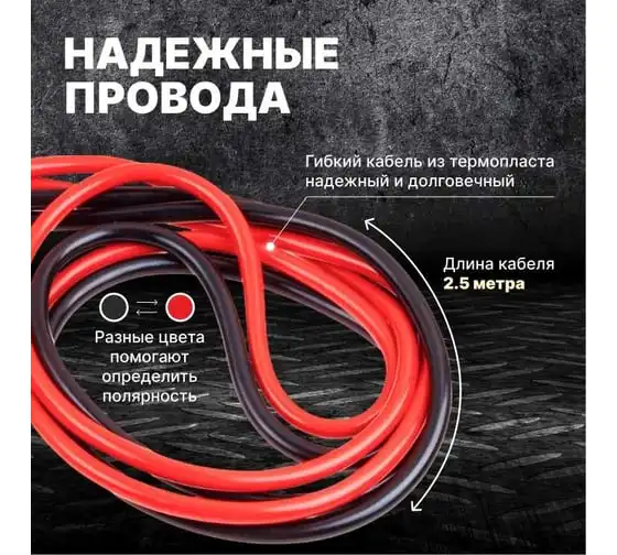 Провода прикуривания предназначены для пуска двигателя автомобиля с разряженной аккумуляторной батареей методом подачи стартового тока на клеммы от АКБ другого автомобиля или от запасного полностью заряженного АКБ. Крепятся на клеммы с помощью специальных изолированных зажимов типа "крокодил" с широким углом захвата, которые обеспечивают надежный контакт. Пусковые провода изолированы термопластичной резиной, легко гнутся и не теряют свою эластичность. Используются при широком температурном диапазоне от -40С до +80С. Длина проводов 2,5 м позволяет легко дотянуться до аккумулятора автомобиля "донора". Рекомендовано использовать для автомобилей с баком 4.5 л бензин / 4.0 л дизель, максимальный объем 5.0 л бензин / 4.5 дизель, также для снегоходов и мотоциклов. Сумка-чехол на молнии в комплекте.
