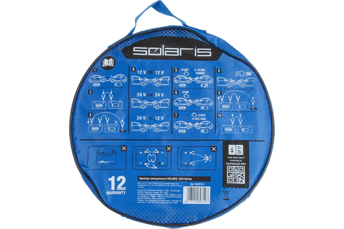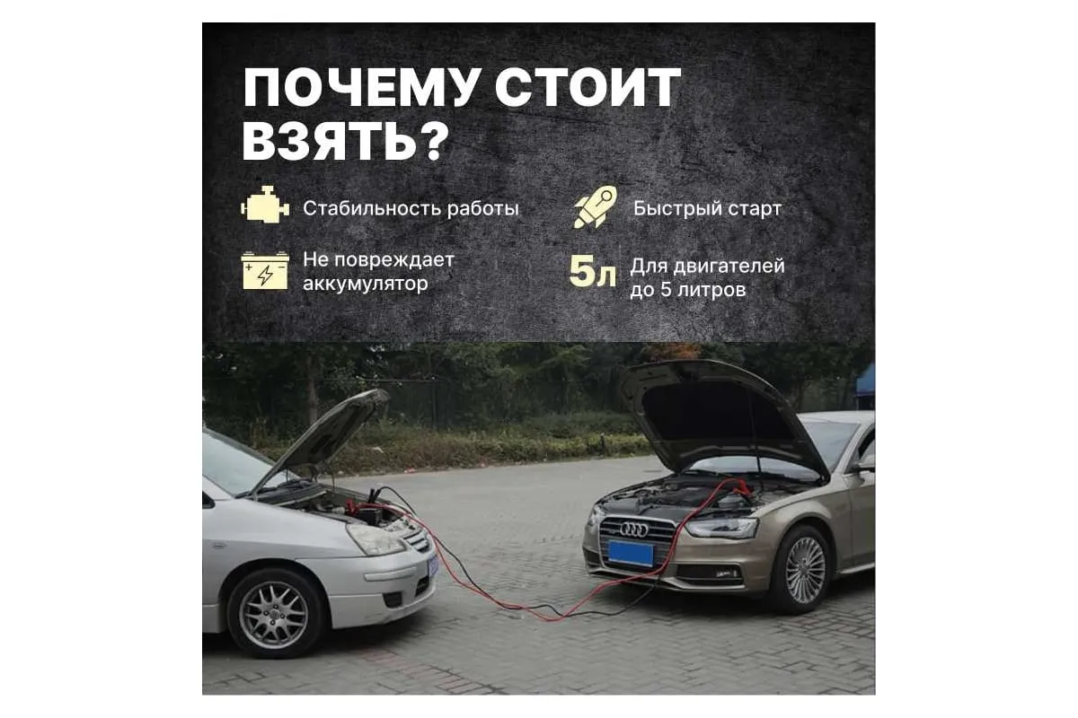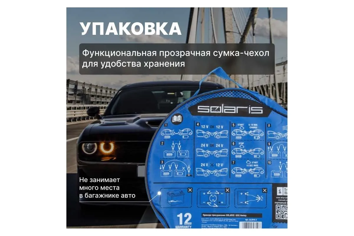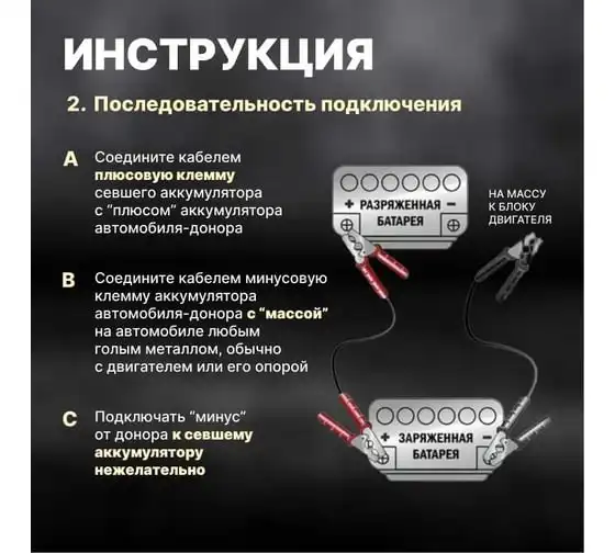 Провода прикуривания предназначены для пуска двигателя автомобиля с разряженной аккумуляторной батареей методом подачи стартового тока на клеммы от АКБ другого автомобиля или от запасного полностью заряженного АКБ. Крепятся на клеммы с помощью специальных изолированных зажимов типа "крокодил" с широким углом захвата, которые обеспечивают надежный контакт. Пусковые провода изолированы термопластичной резиной, легко гнутся и не теряют свою эластичность. Используются при широком температурном диапазоне от -40С до +80С. Длина проводов 2,5 м позволяет легко дотянуться до аккумулятора автомобиля "донора". Рекомендовано использовать для автомобилей с баком 4.5 л бензин / 4.0 л дизель, максимальный объем 5.0 л бензин / 4.5 дизель, также для снегоходов и мотоциклов. Сумка-чехол на молнии в комплекте.