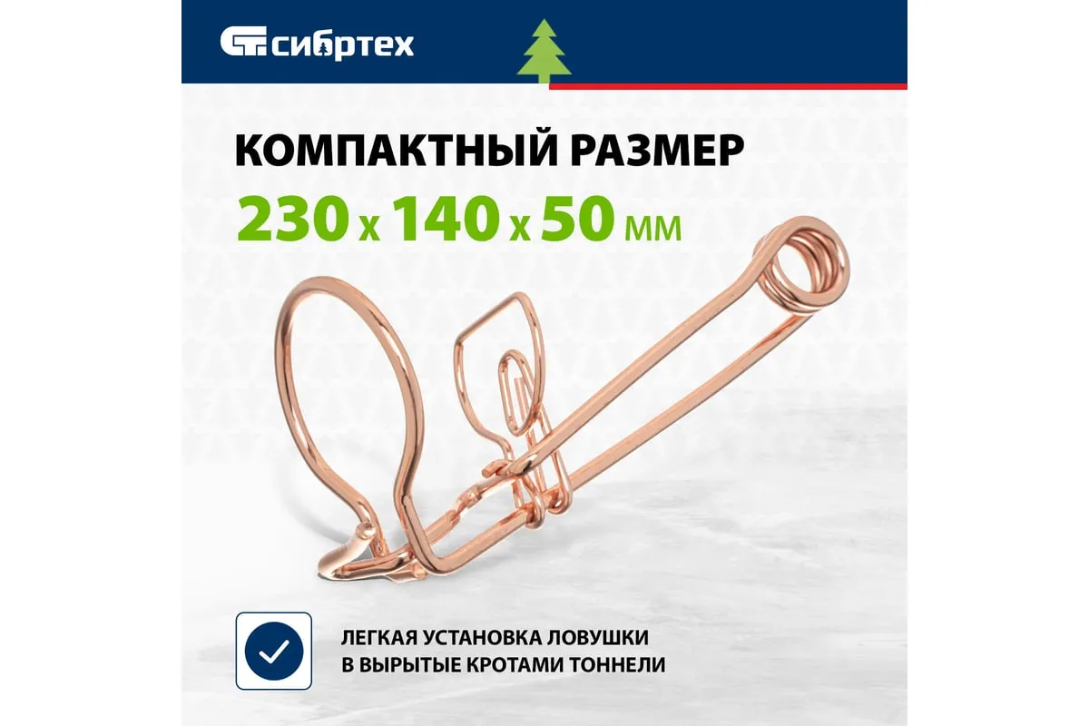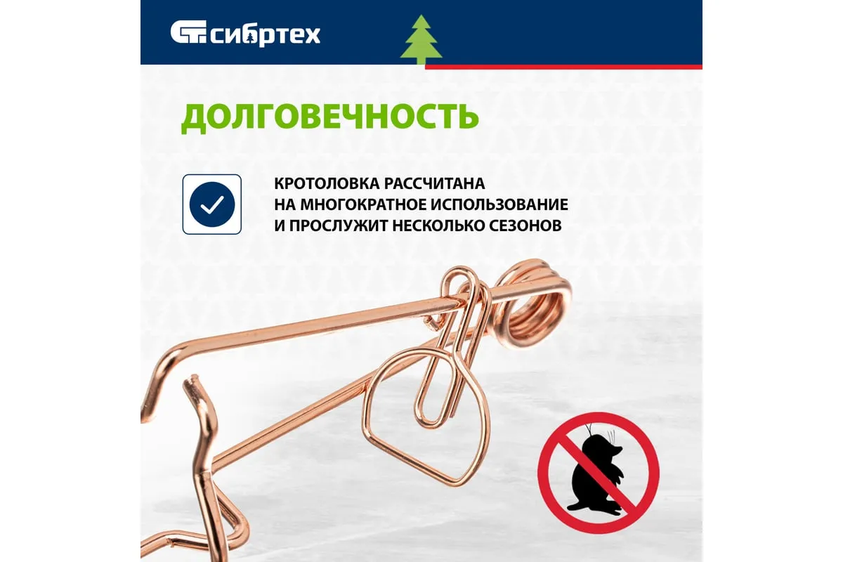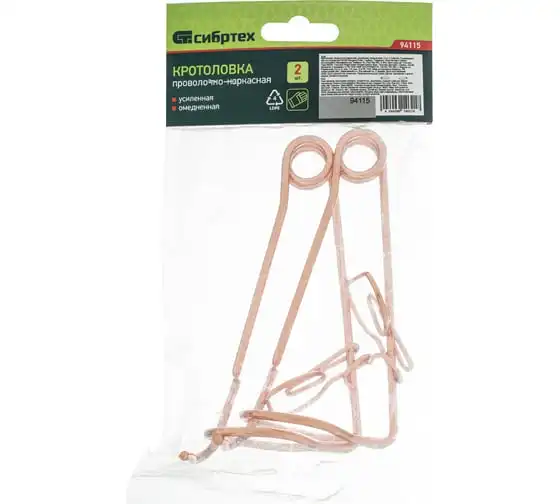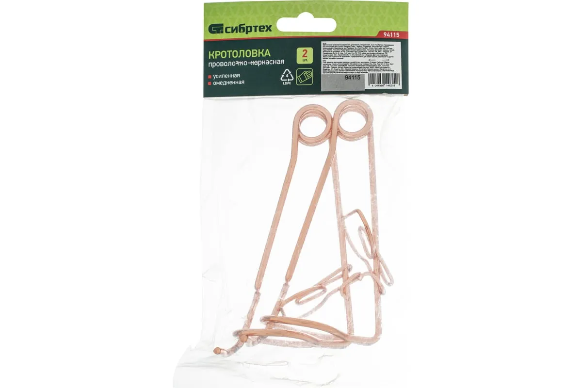 Усиленная проволочно-каркасная кротоловка Сибртех, 94115, омедненная, 2 шт., предназначена для ловли кротов. С ее помощью можно избавиться от вредителей на дачном участке. Кротоловку легко скрыть в земле, чтобы животные ее не обнаружили. При этом она не заедает при попадании посторонних предметов.
