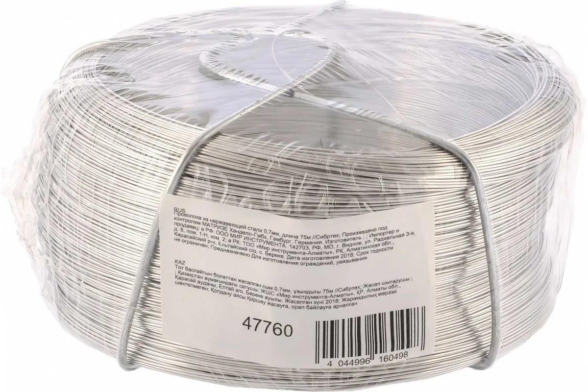 Проволока из нержавеющей стали Сибртех 47760 диаметром 0,5 мм и длиной 200 м имеет гладкую и блестящую текстуру, поэтому оптимально подходит для рукоделия. Также пригодится в быту для увязывания и фиксации предметов, изготовления сеток и рамок и т.д.