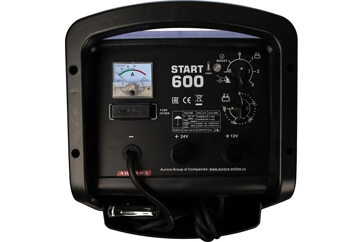 Пуско-зарядное устройство AURORA START 600 BLUE 12913 широко используется в гаражах и автопарках для быстрого пуска мотоциклов, автомобилей, грузовиков, а также для зарядки аккумуляторных батарей напряжением 12 В и 24 В. Модель имеет встроенную защиту от перегрузок и смены полярности, чем обеспечивает сохранность электрической цепи автотранспортного средства.