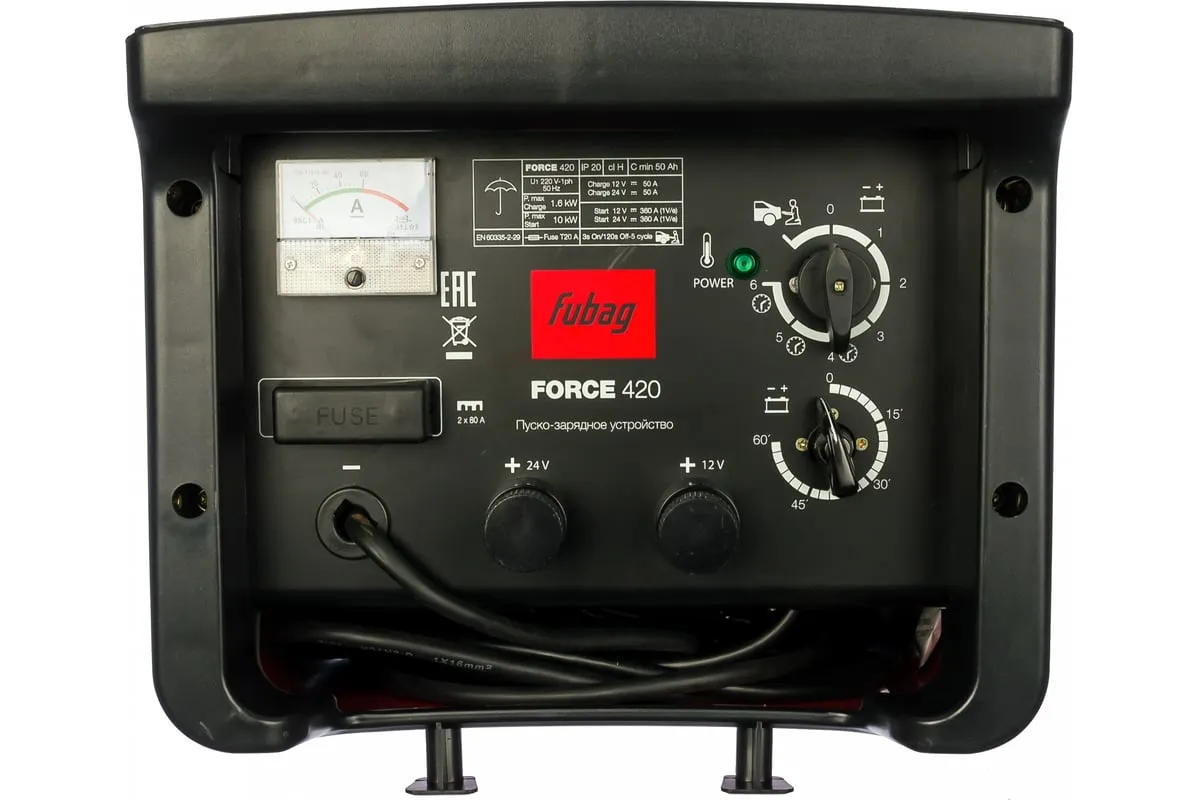 Пуско-зарядное устройство Fubag FORCE 420 - профессиональный прибор, который позволяет быстро и уверенно запустить двигатель автомобиля даже при полностью разряженном аккумуляторе независимо от вида используемого автомобилем топлива. Аппарат удобен в подключении и не требует от пользователя приобретения специальных навыков. Удобная рукоятка в совокупности с колесами обеспечивают простоту и легкость перемещения прибора.