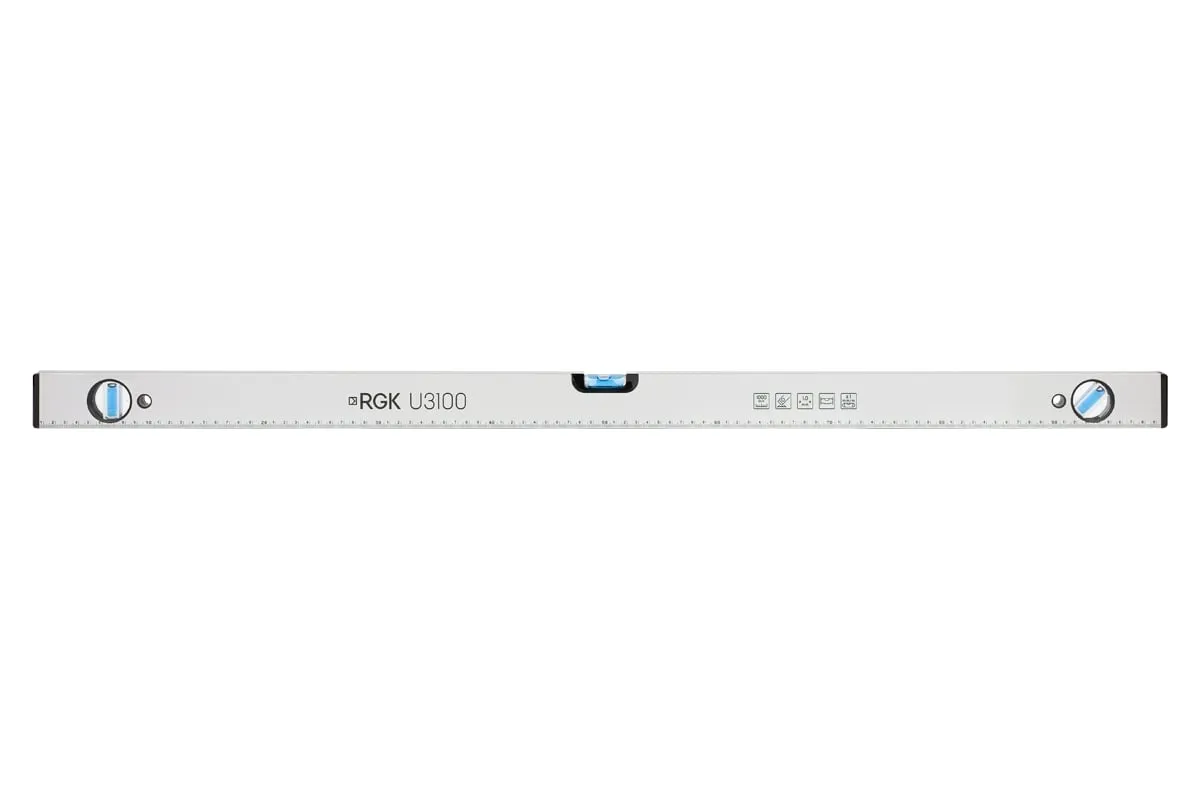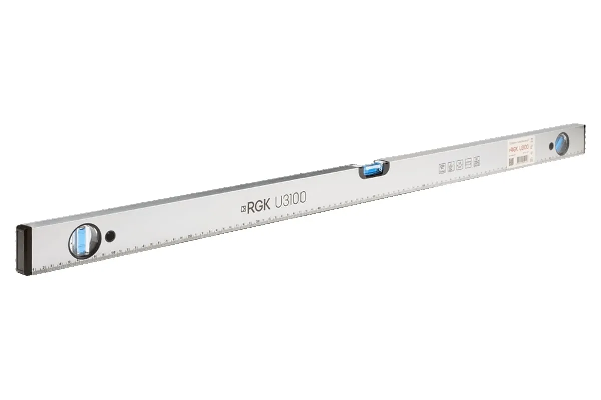 Устройство выполнено в коробчатом корпусе длиной 1 м и изготовлено из алюминиевого профиля. Боковые стороны защищены от случайных ударов вставками-заглушками из прочного пластика. Для подвешивания строительного уровня при хранении предусмотрены два сквозных отверстия около вертикальной и наклонной ампул.