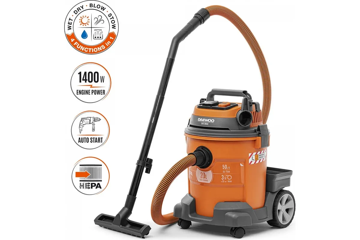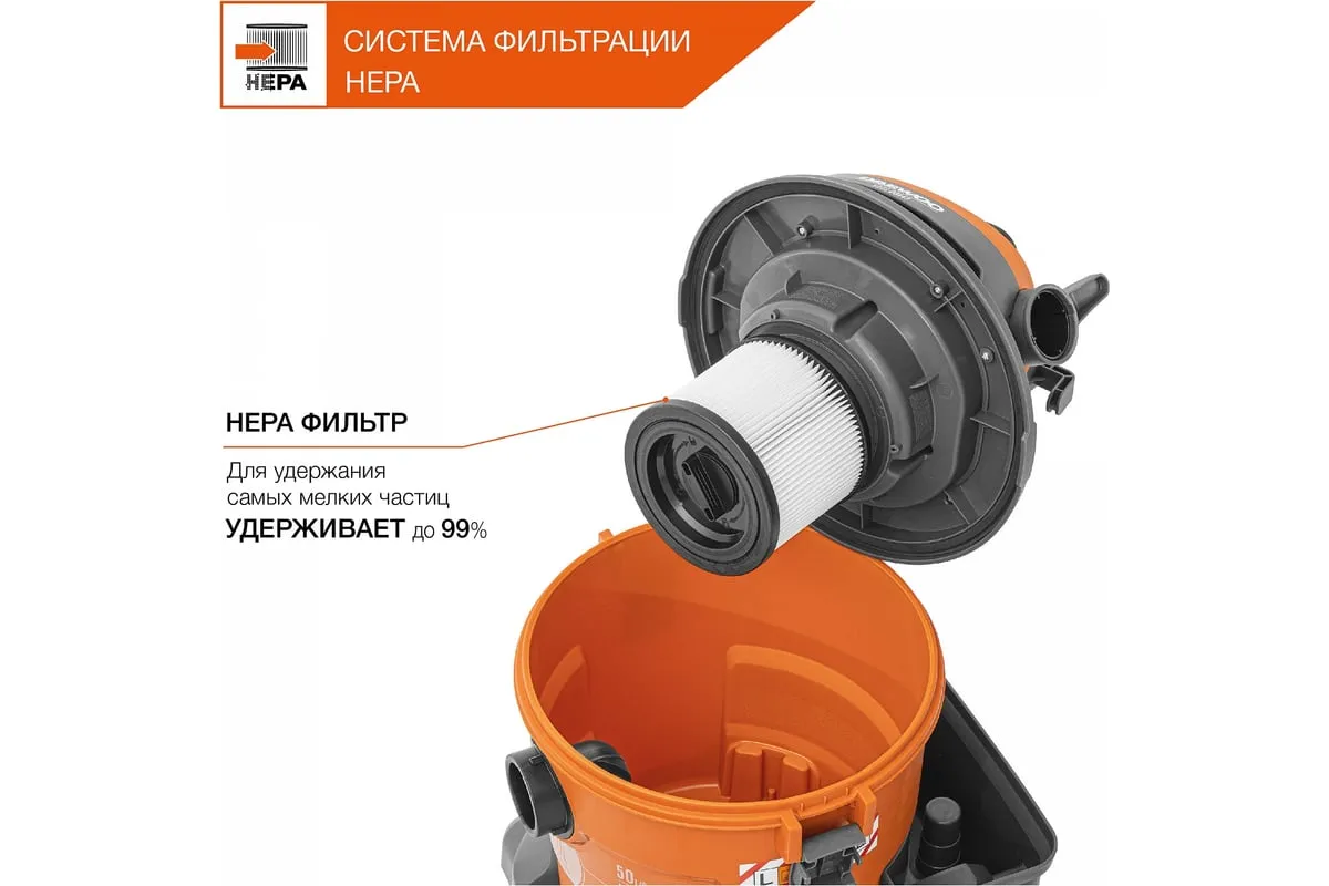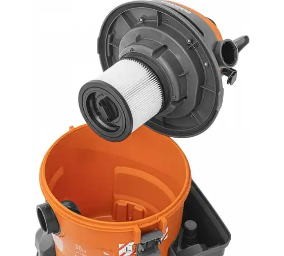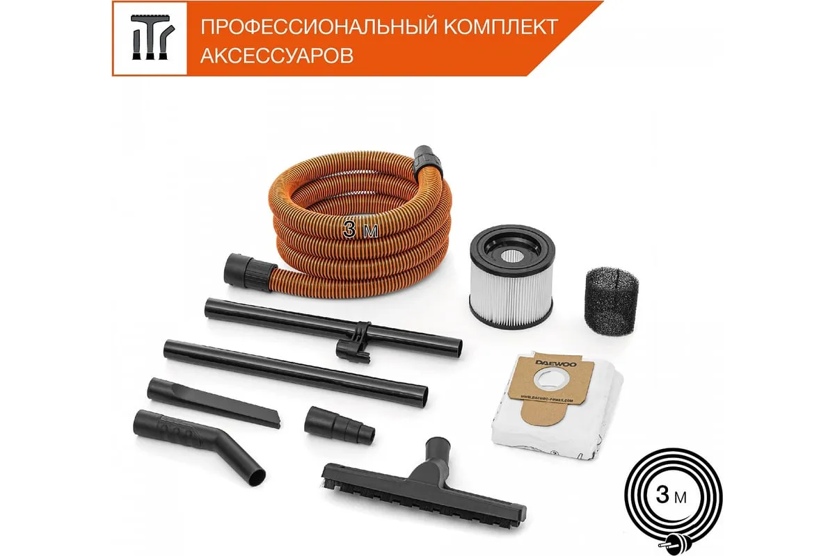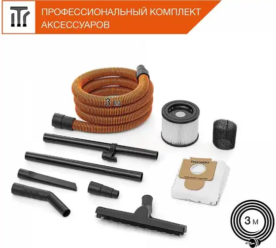 Шланг длиной 3 м позволяет собирать строительный мусор на высоте, без необходимости поднимать пылесос.