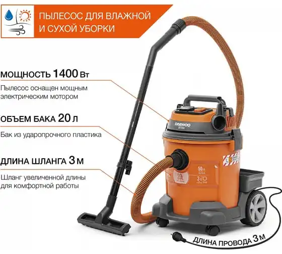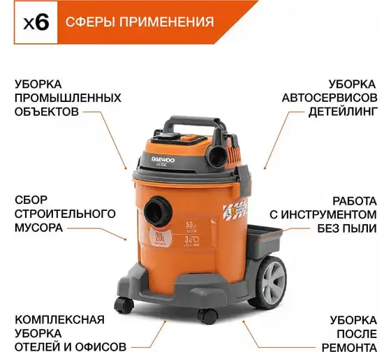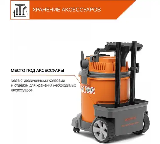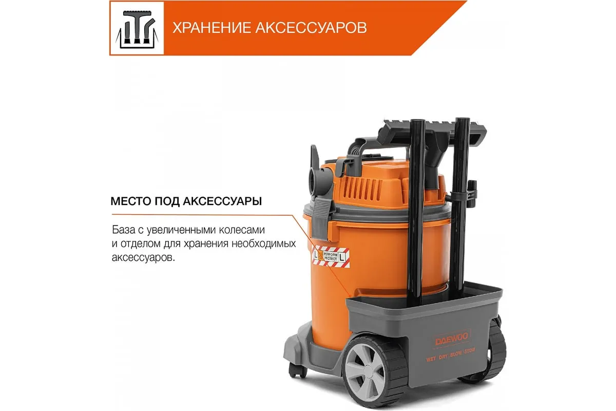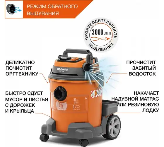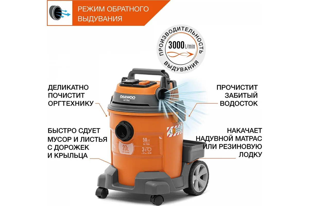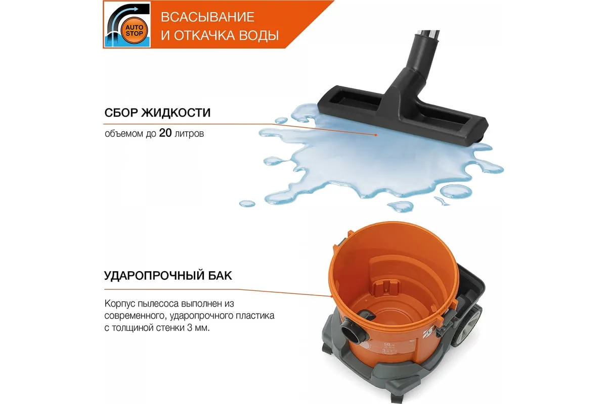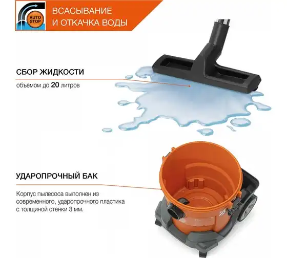 Функция всасывания и откачки воды позволяет эффективно собирать жидкость с любого покрытия в объеме до20 литров.