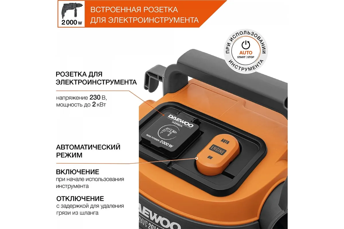 Автоматическое включение пылесоса при начале использования инструмента и отключение с задержкой для удаления грязи из шланга.