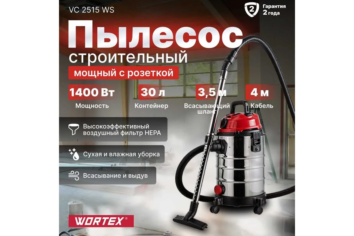 Пылесос WORTEX VC 2515 WS в упаковка 1334468 компактный и надежный пылесос для сухой и влажной уборки, а также с дополнительной розеткой для работы с электроинструментом. В базовую комплектацию входит шланг 3,5 м , а так же электрический провод4 м, для большего удобства в работе. Надежный и мощный двигатель 1400 Вт.