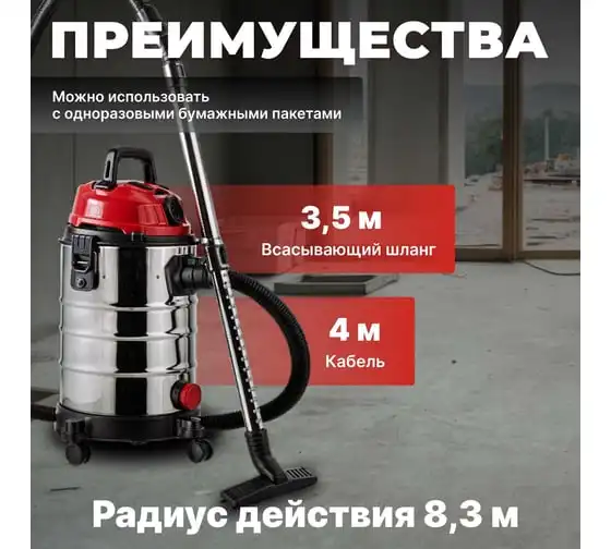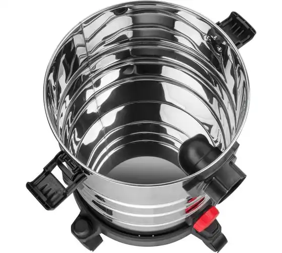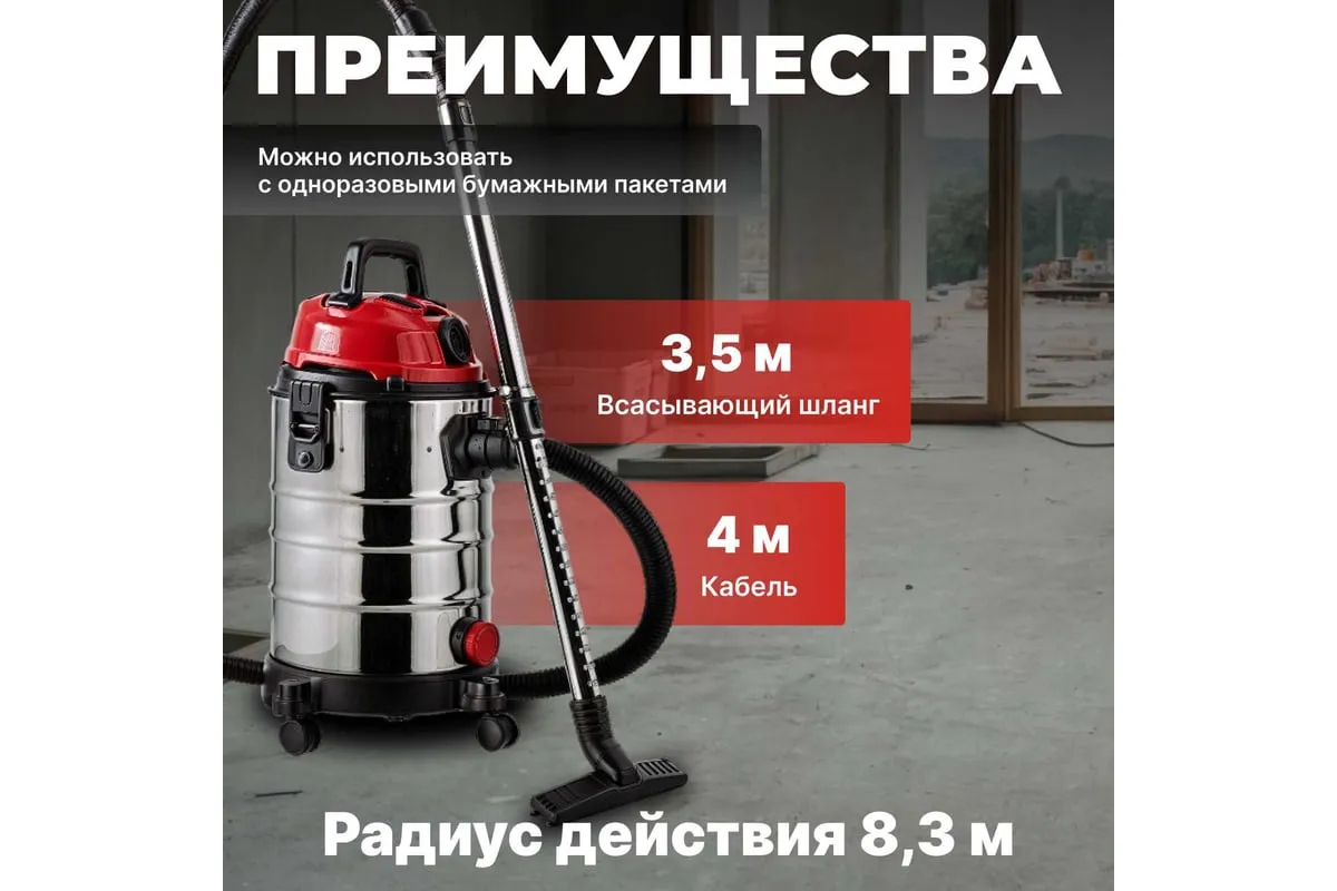 Несколько степеней фильтрации обеспечивается за счет фильтра тонкой очистки (HEPA), который входит в комплект поставки. Возможно также использовать с одноразовыми бумажными мешками. Пылесос также оснащен специальным отверстием для слива воды из бака. А легкий и прочный корпус из нержавеющей стали обеспечит долгий срок службы инструмента. Присутствует функция выдува, а также телескопическая трубка. Обладает раздвижной телескопической трубкой и трехпозиционным переключателем.