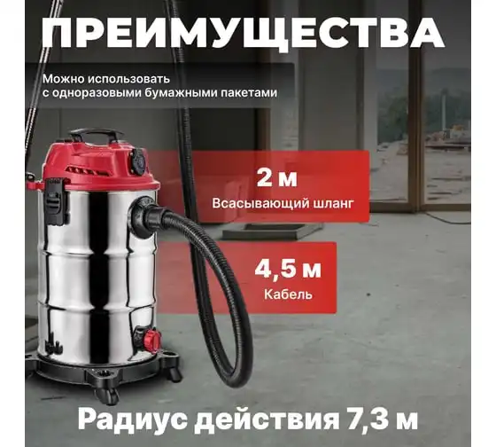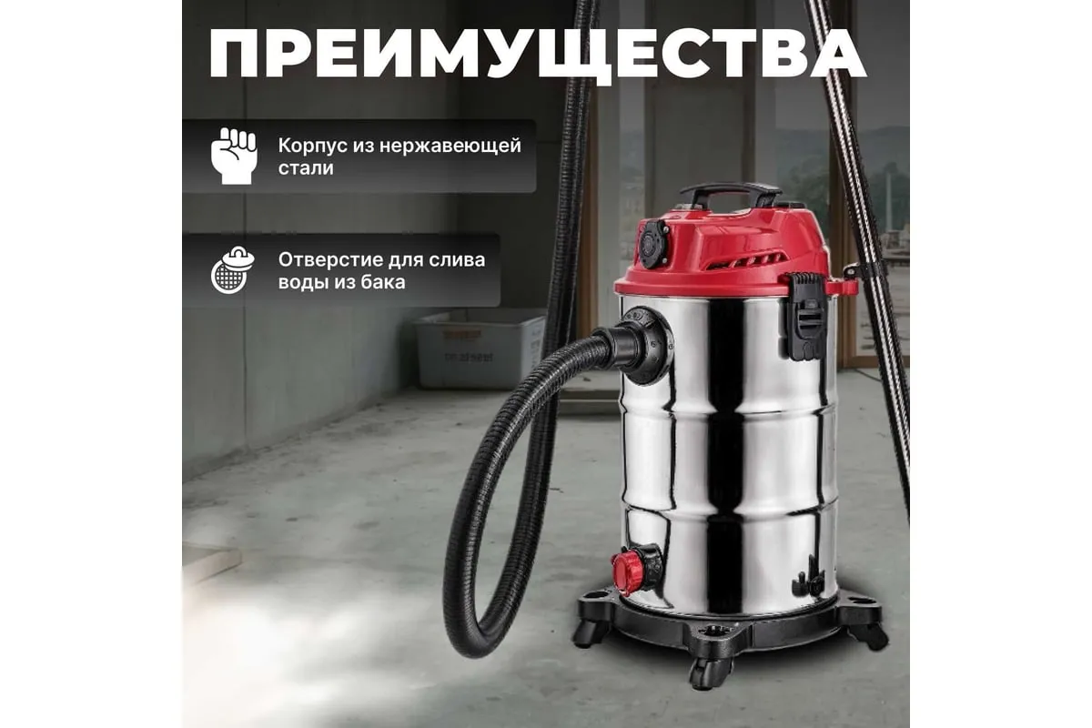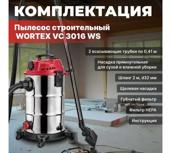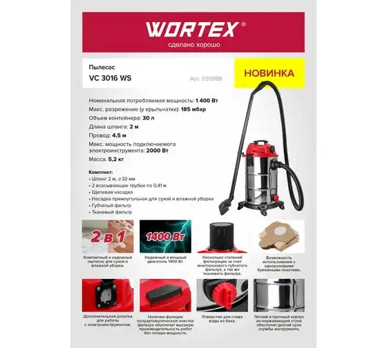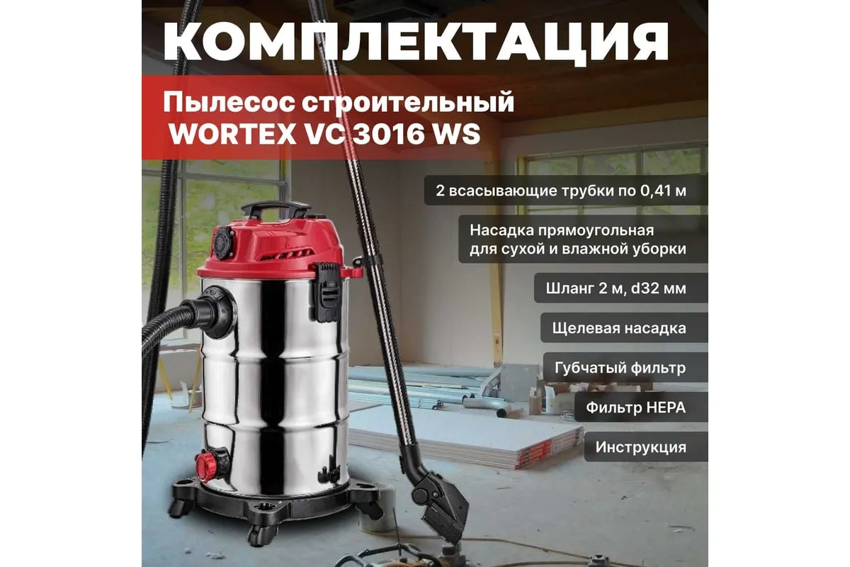 Пылесос WORTEX VC 3016 WS 0319188 - компактный и надежный пылесос для сухой и влажной уборки, оснащен дополнительной розеткой для работы с электроинструментом.