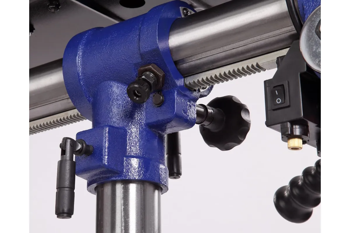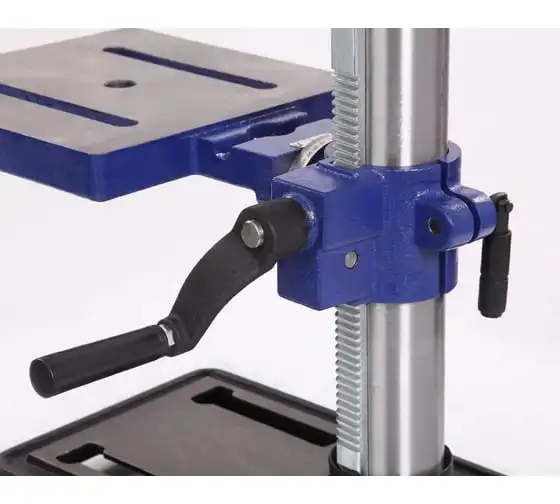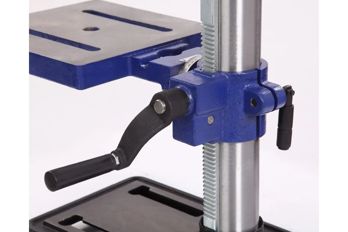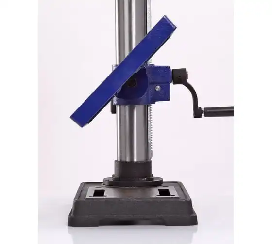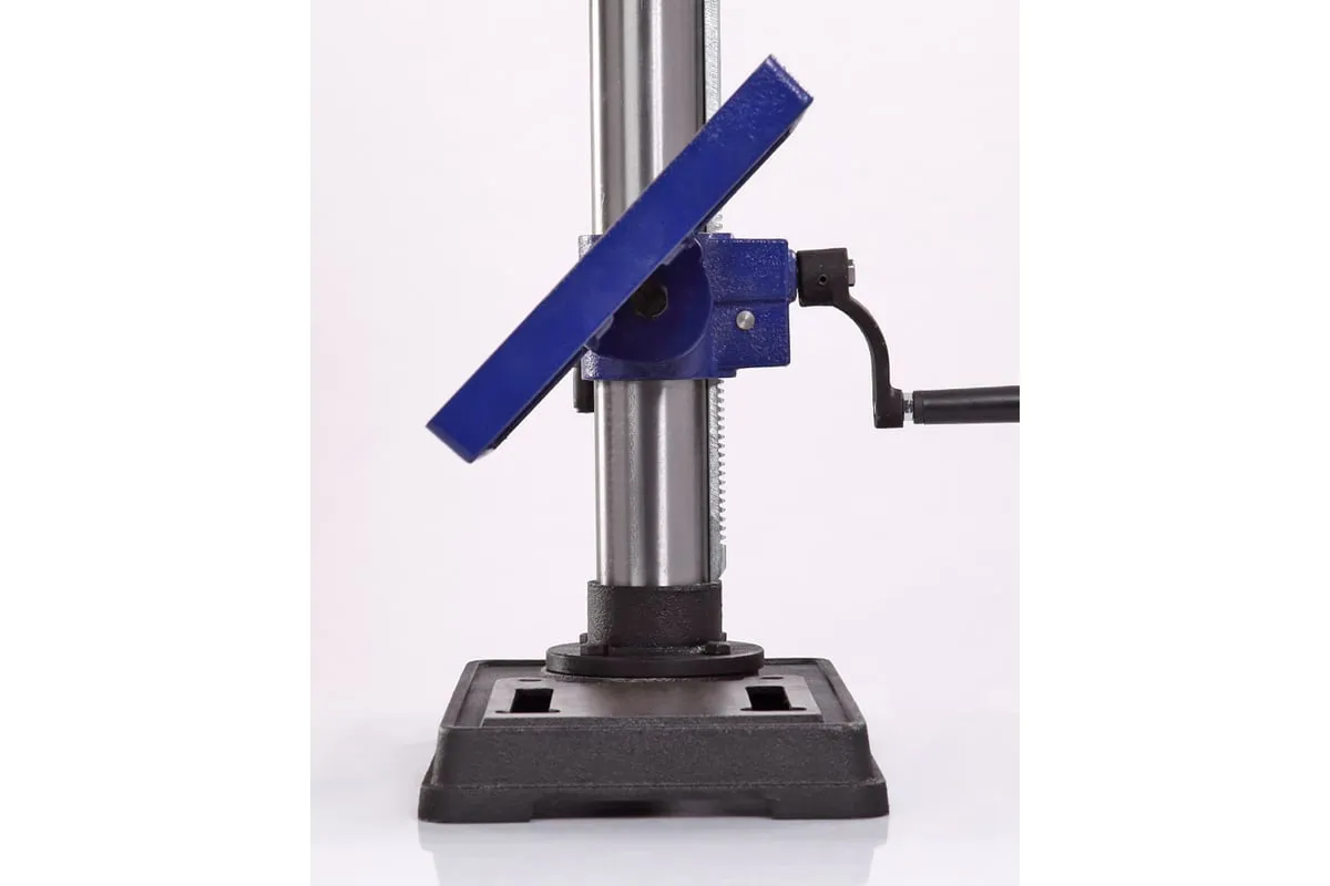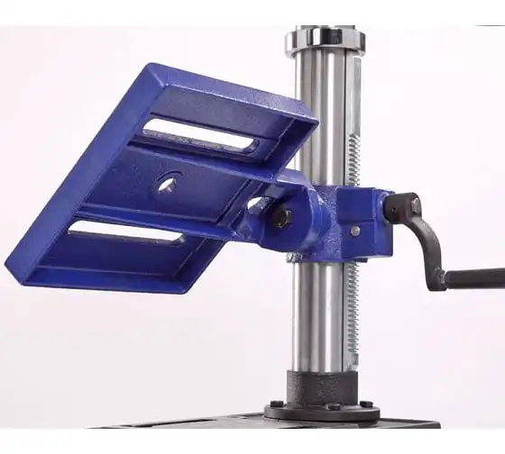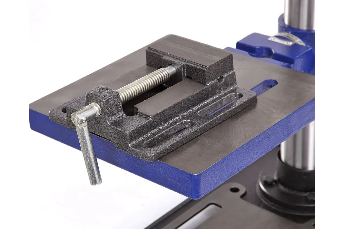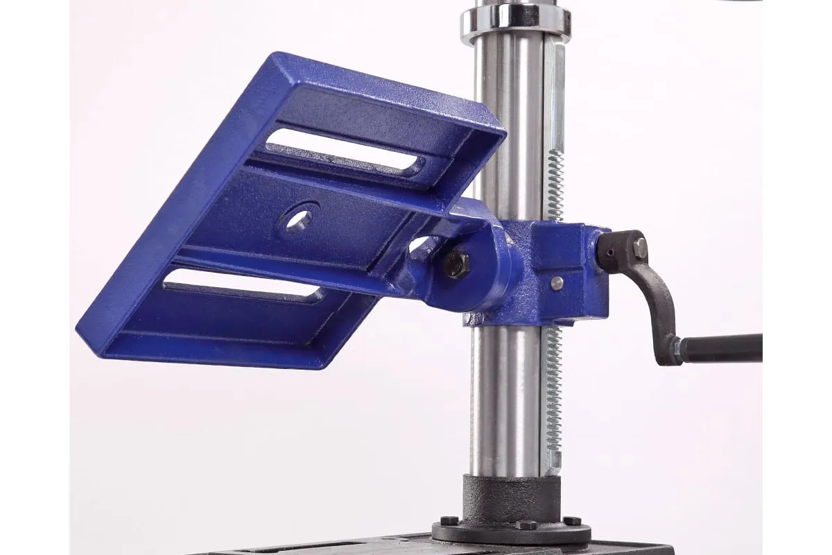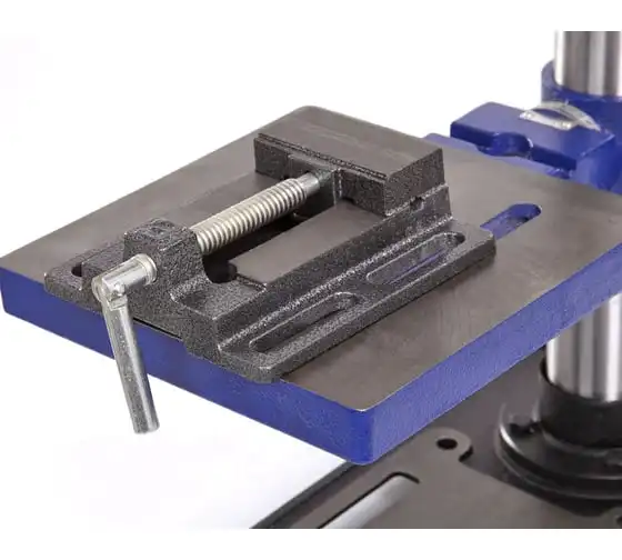 Станок имеет средний размер, исполнение настольное, высота в сборе – 810 мм. Максимальное расстояние между шпинделем и столом – 355 мм. Заготовку можно крепить как к рабочему столу, так и к основанию, все зависит от ее размера. В комплекте предусмотрены тиски. Для их крепления есть по два паза на рабочем столе и на основании.