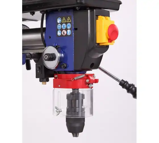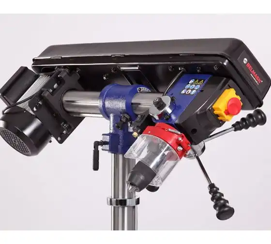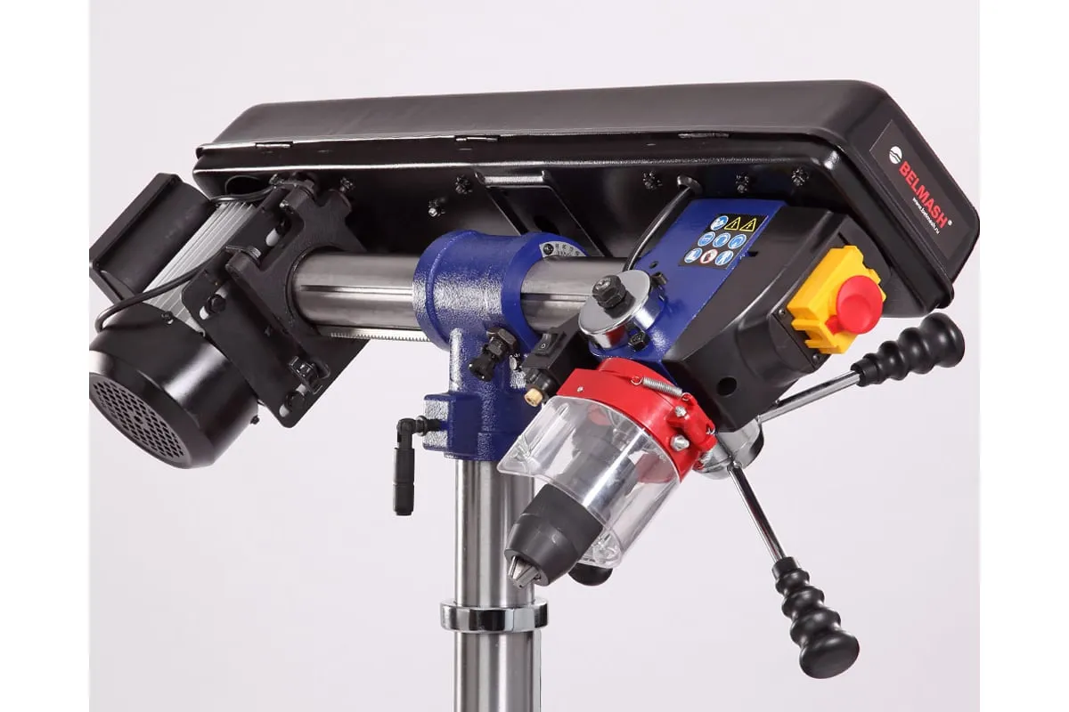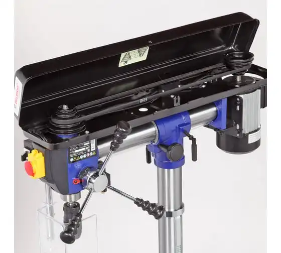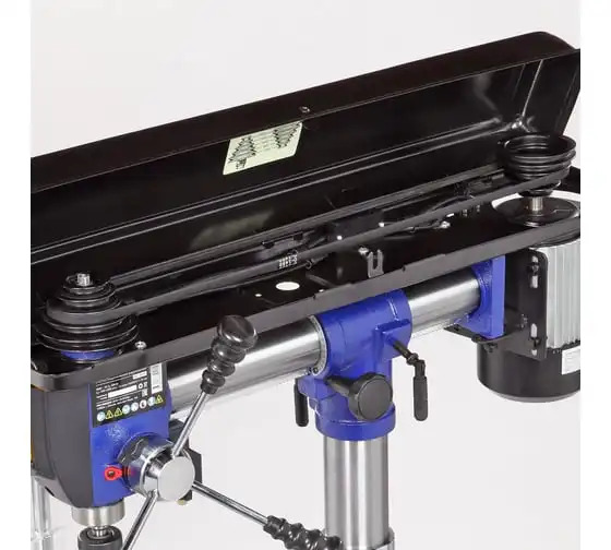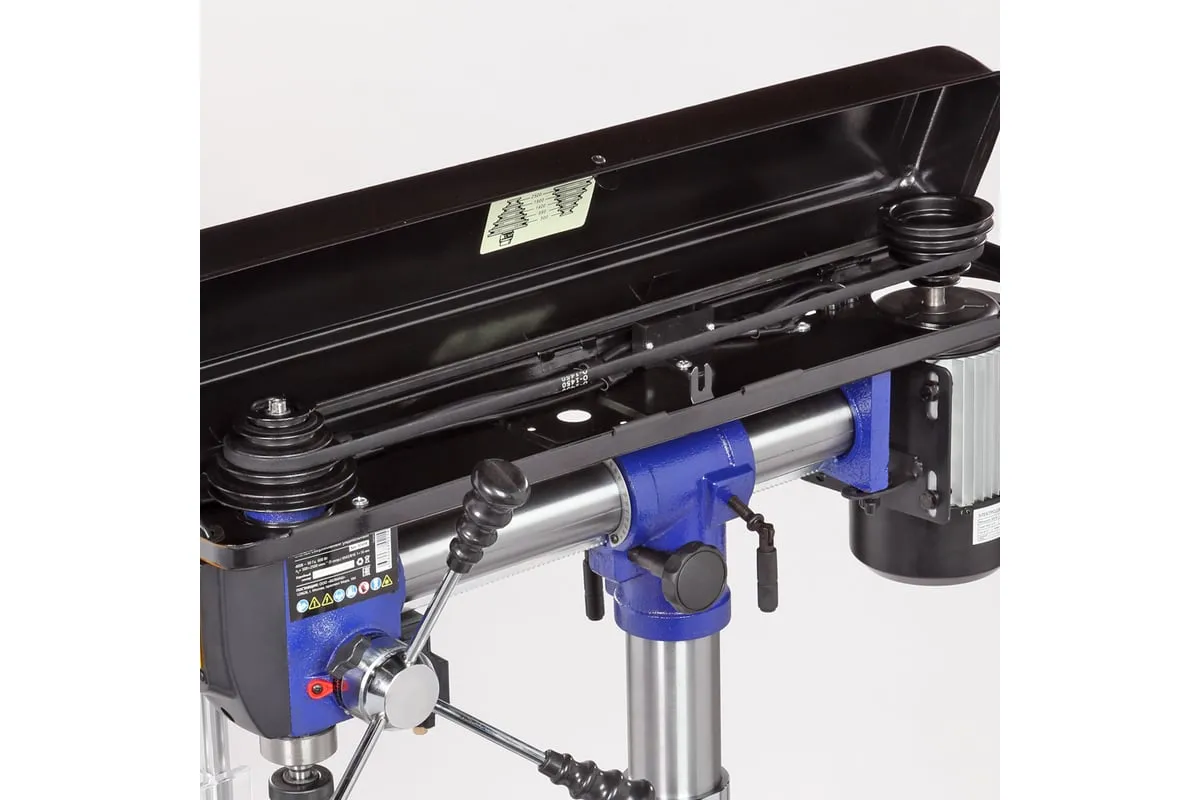 Двигатель асинхронный, мощностью 600 Вт. Станок рассчитан на подключение к трехфазной сети 400 В. Имеется пять скоростей шпинделя (от 500 до 2500 об/мин), что необходимо при выполнении различных операций и для разных материалов. Переключение происходит за счет переброски ремня. Для этого необходимо открыть крышку ременного отсека, ослабить барашек крепления двигателя, тем самым получив возможность смещения шкива, перекинуть ремень и проделать операцию в обратной последовательности.