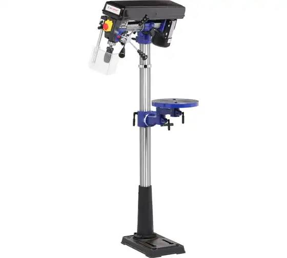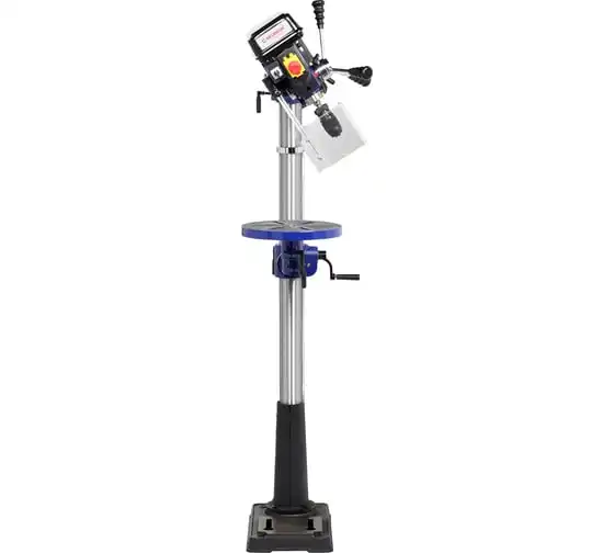 Заготовку можно крепить как к рабочему столу, так и к основанию. В комплекте предусмотрены тиски. Для их крепления есть шесть пазов на рабочем столе и два на основании. Рабочий стол (диаметр 300 мм) имеет регулировку по высоте, возможность как наклона (-45…+45°) и поворота.