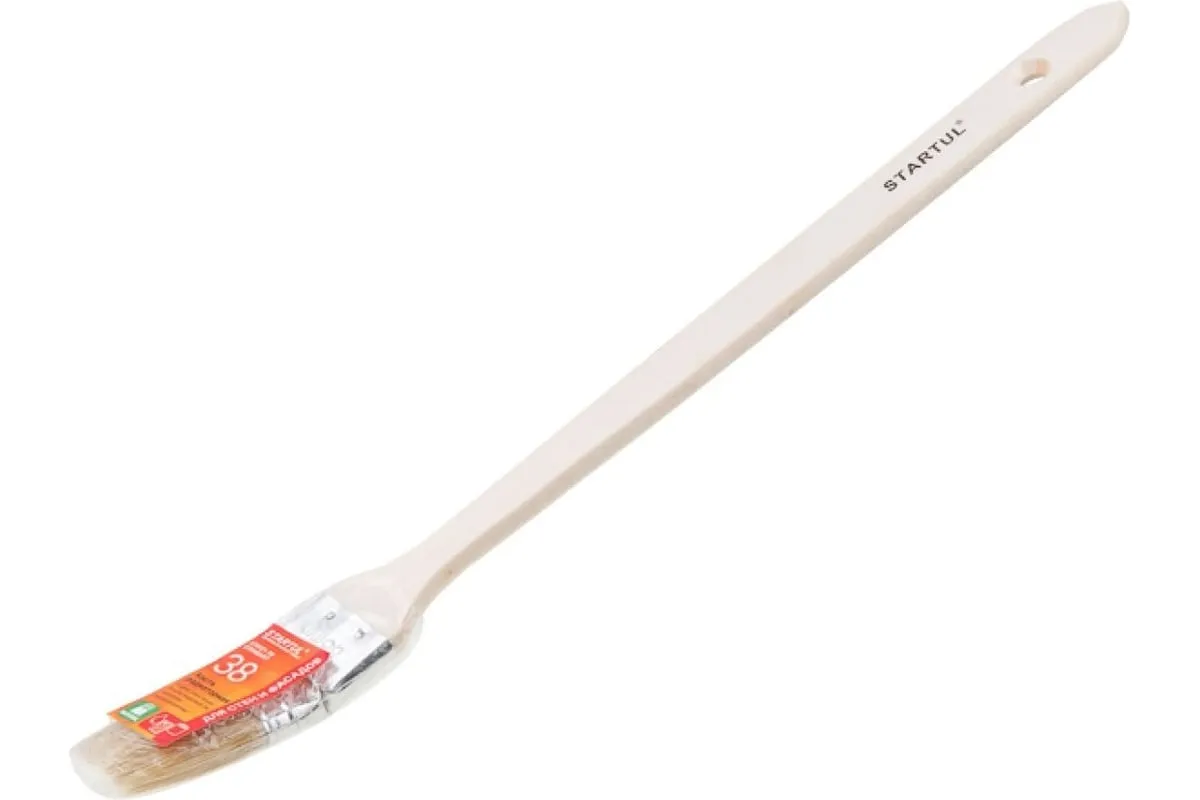 Радиаторная кисть предназначена для выполнения различных внутренних и внешних малярных работ в труднодоступных местах. Используется со всеми типами лакокрасочных материалов (ЛКМ), применяются преимущественно при окрашивании лакокрасочными материалами на масляной основе и густыми лаками, олифой и эмалями. 100% натуральная светлая щетина устойчива к сильным растворителям, обладает хорошей краскоотдачей, равномерное распределение краски по окрашиваемой поверхности. Имеет определенные ограничения при применении ЛКМ на водной основе, так как натуральная щетина впитывает в себя воду. Бандаж - металлический с антикоррозийной обработкой. Рукоять деревянная с отверстием для подвеса.