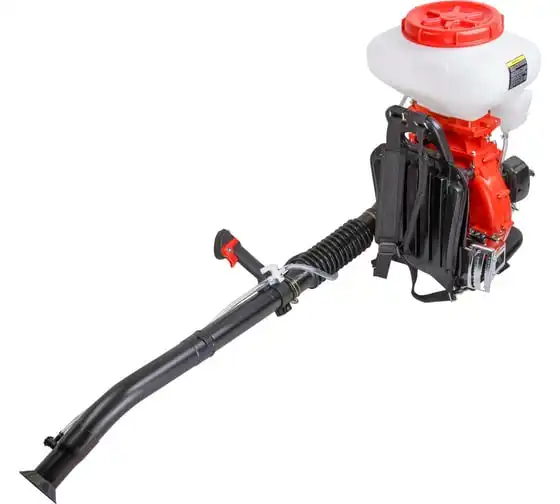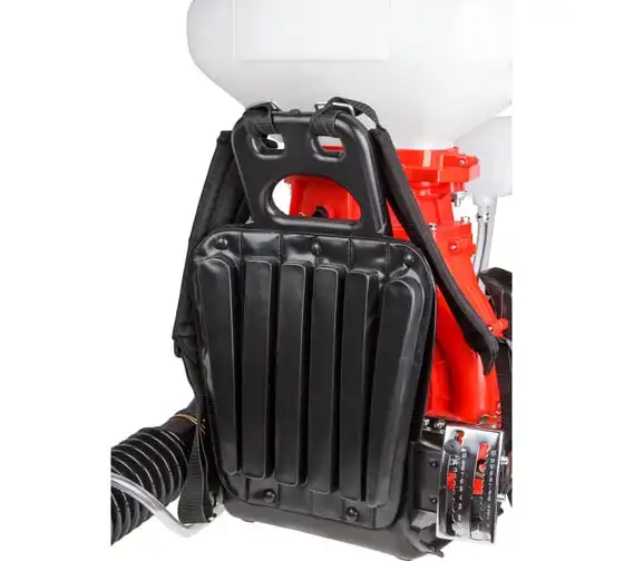 В конструкции опрыскивателя есть помпа для подачи жидкости в трубу распылителя, дальнейшее ускорение распыления создается потоком воздуха.