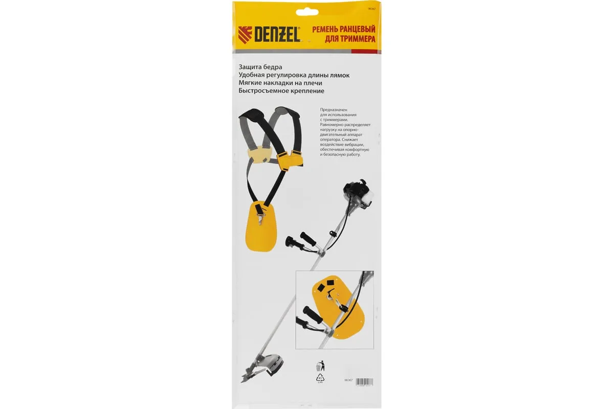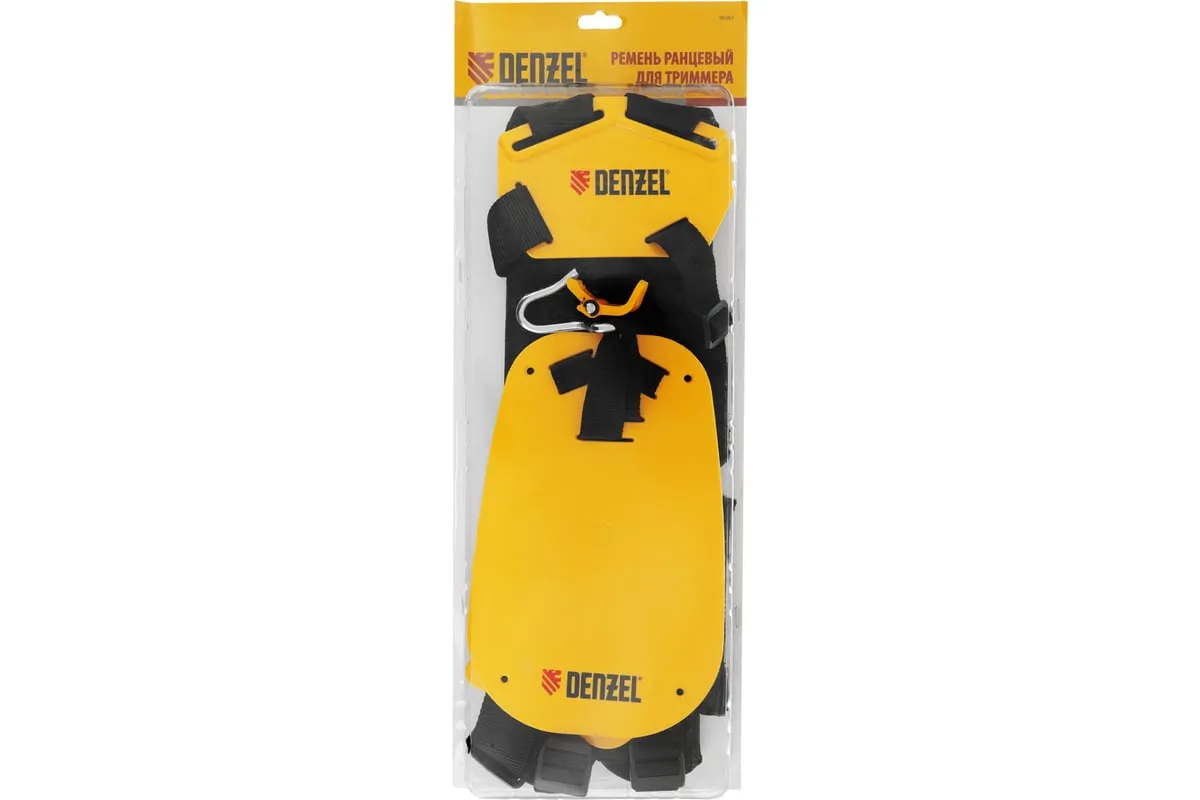 Ранцевый ремень Denzel 96367 с защитой бедра используется с бензиновыми триммерами Denzel. Двухплечевая подвесная система равномерно распределяет вес инструмента, снижая нагрузку на спину, поэтому она подходит для профессиональных работ на участках большой площади.