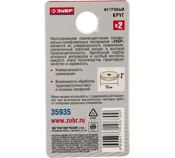 Фетровый круг Зубр d 12x8 мм 2 шт. 35935