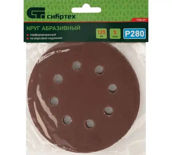 Круг абразивный перфорированный на ворсовой подложке под липучку 5 шт, 125 мм, P280 СИБРТЕХ 738127