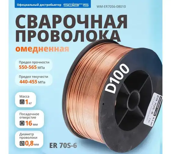 Проволока сварочная ER 70S-6 0.8 мм, омедненная, 1 кг SOLARIS WM-ER70S6-08010