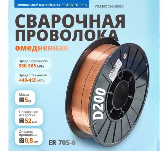 Проволока сварочная омедненная ER 70S-6 (0.6 мм; катушка D200; 5 кг) SOLARIS WM-ER70S6-06050