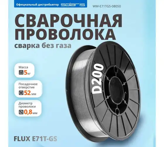 Проволока сварочная FLUX E71T-GS 0.8 мм, 5 кг, без газа, порошковая SOLARIS WM-E71TGS-08050