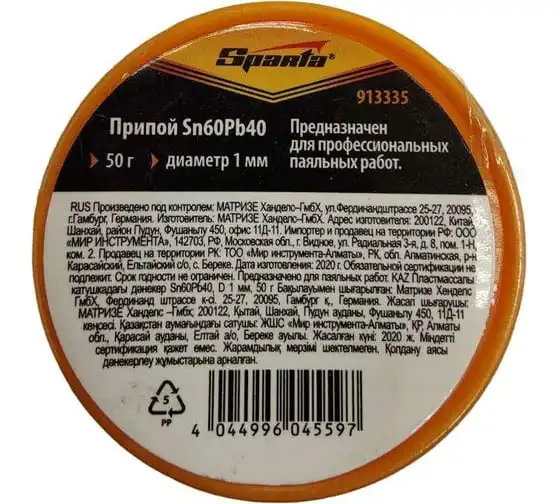 Припой Sn60Pb40 (1 мм; 17 г; в пластмассовой тубе) SPARTA 913315