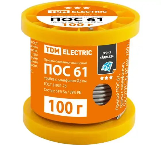Припой ПОС 61 трубка с канифолью серия Алмаз (2 мм, 100 г, ГОСТ 21931-76, катушка) TDM SQ1025-0307