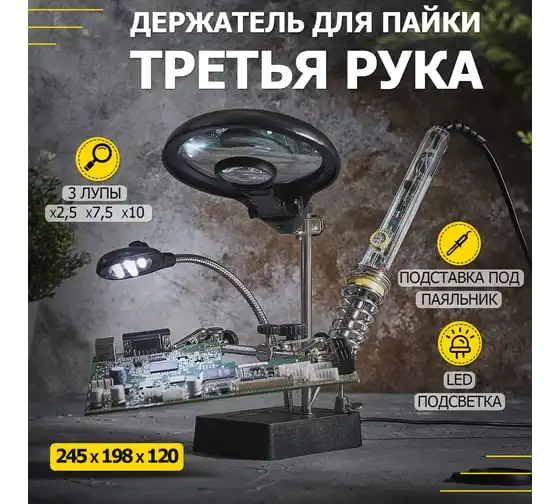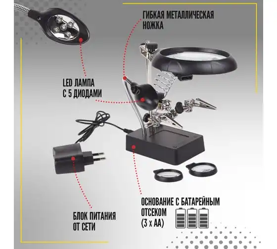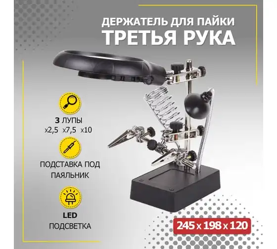 Держатель третья рука с лупой х2.5 + x7.5, подставкой под паяльник и LED подсветкой ZD-126-3 REXANT 12-0250