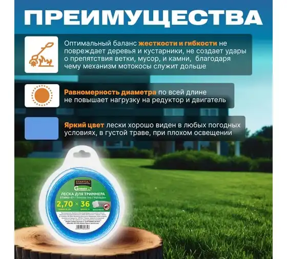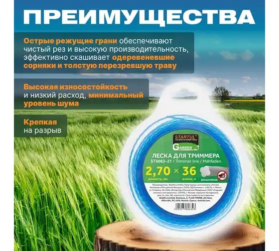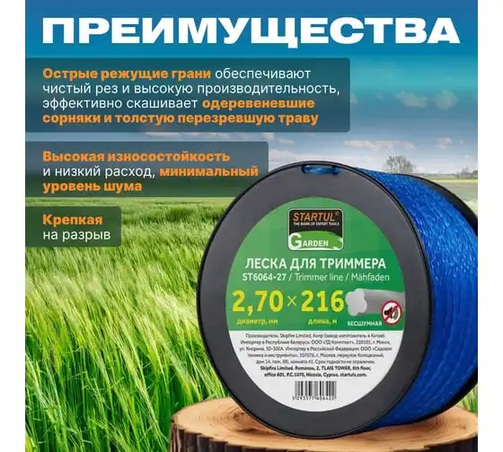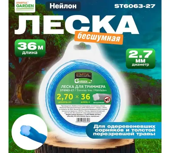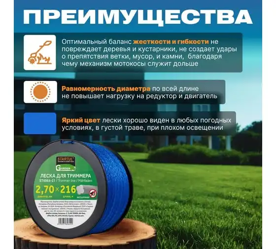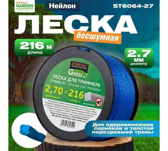 Леска для триммера Garden 2.7 мм, 216 м, сечение 4-лепестковая бесшумная STARTUL ST6064-27