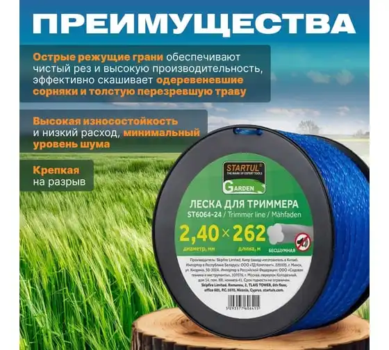 Леска для триммера Garden 2.4 мм, 262 м, сечение 4-лепестковая бесшумная STARTUL ST6064-24