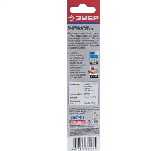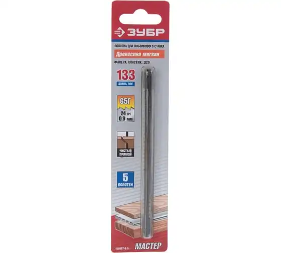 Полотно для лобзикового станка ЗСЛ-90 и ЗСЛ-250; по мягкой древесине; сталь 65Г, L=133мм, шаг зуба 0,9мм 24 TPI, 5шт Зубр 155807-0.9