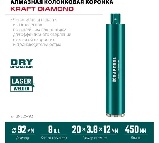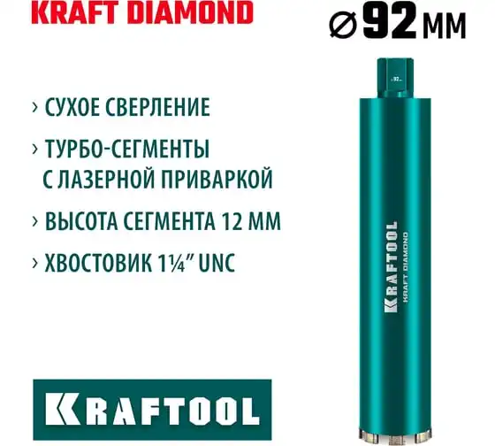 Алмазная коронка по железобетону KRAFTOOL Diamond 92 мм 29825-092