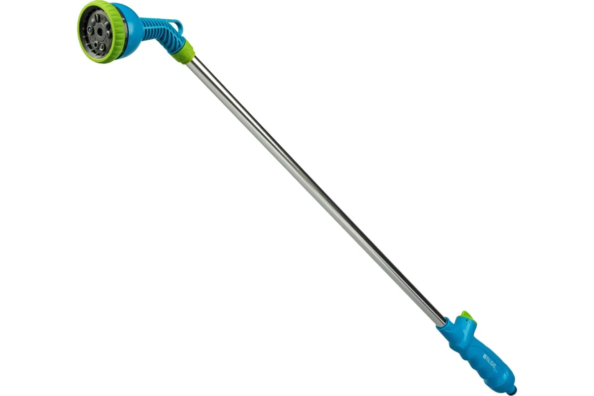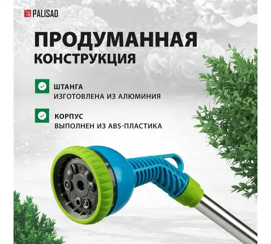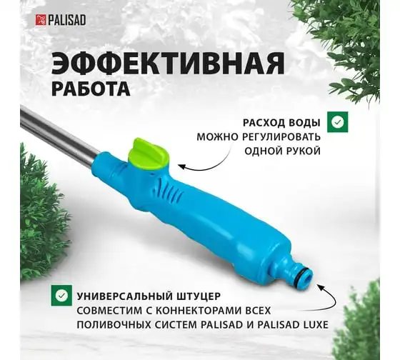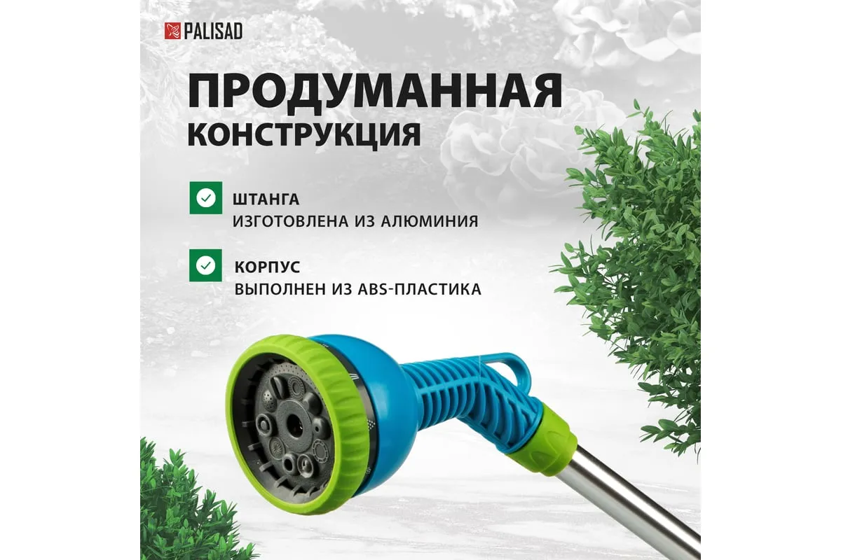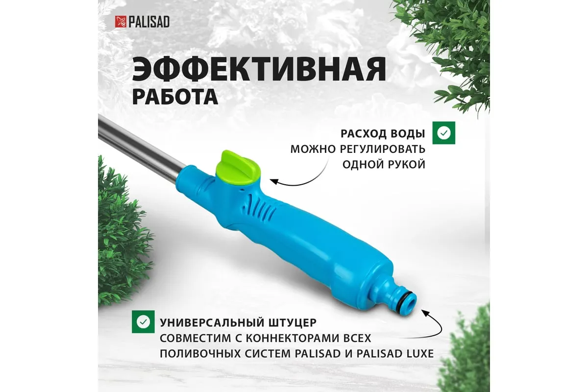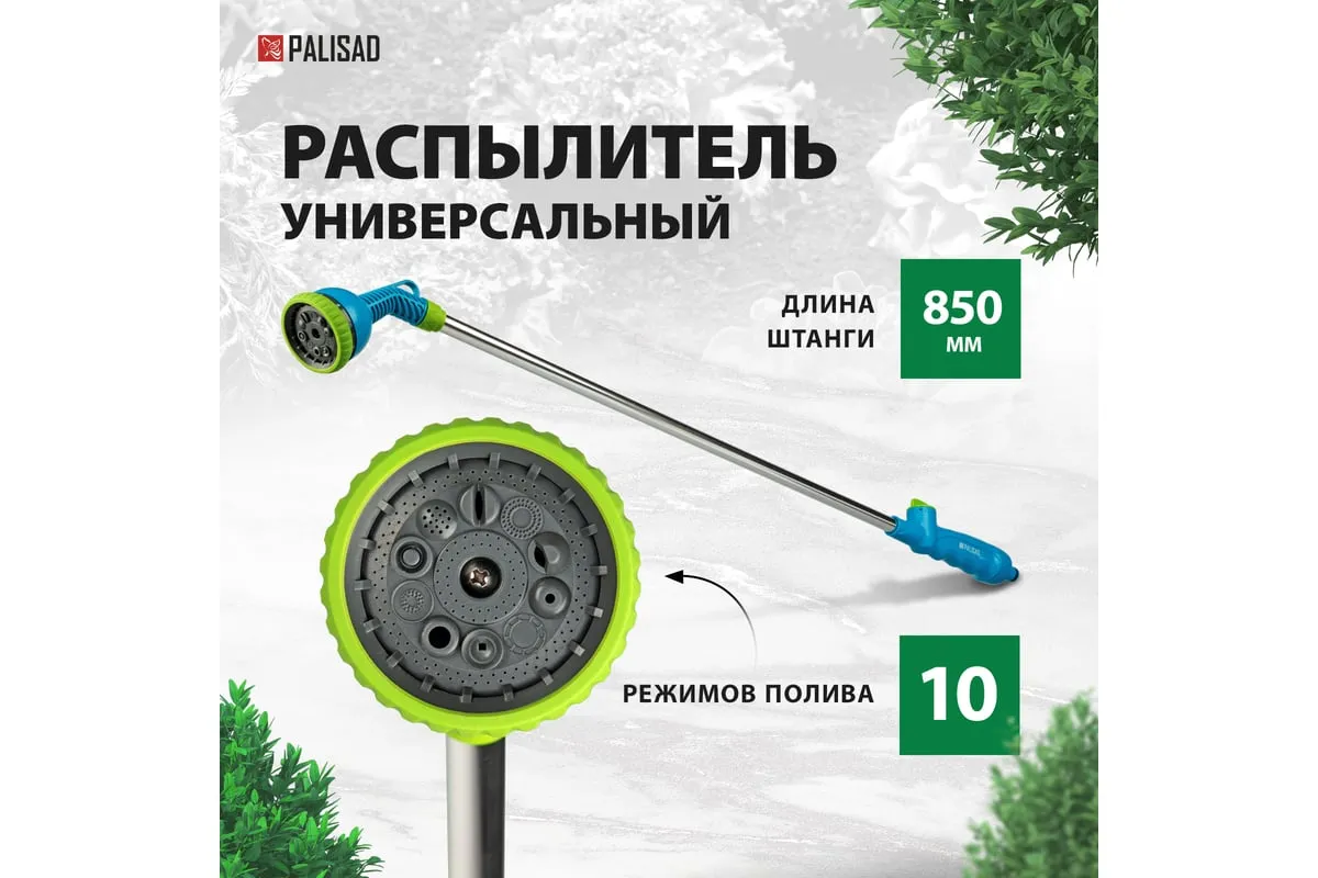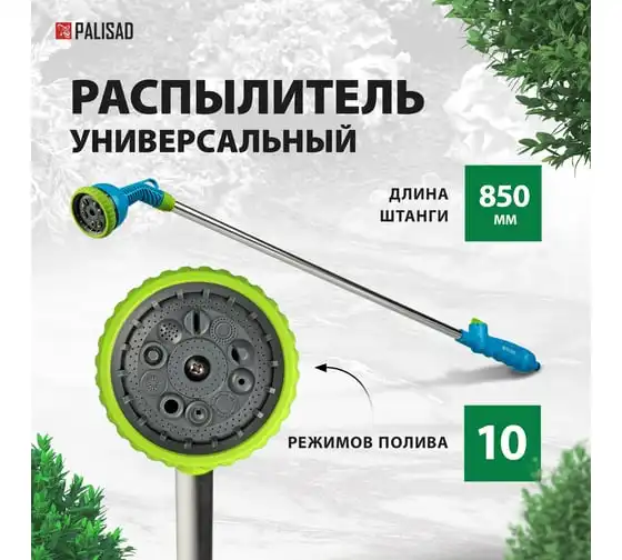 Распылитель Palisad Luxe 65801 на алюминиевой штанге длиной 850 мм, с 10 режимами работы, подходит для орошения участков большой площади и растений в цветочных горшках, а также для очистки удаленных и труднодоступных мест. Расход воды можно плавно регулировать одной рукой, что облегчает решение поставленных задач.