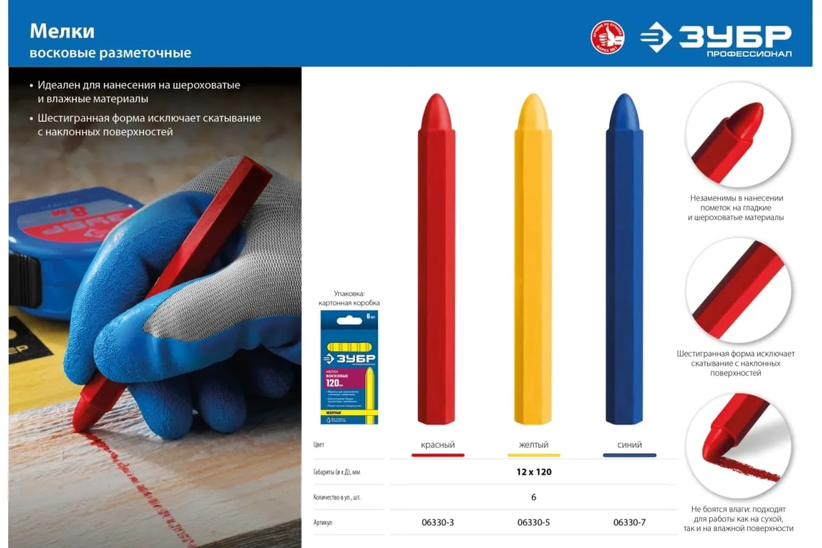 Разметочные восковые мелки ЗУБР МВР синие, 6 шт. 06330-7 незаменимы при нанесении пометок на гладкие и шероховатые материалы (металл, бетон, пластик, керамику, древесину, резину, картон и т.д.). Изделие не боится влаги и подходит для работы как на сухой, так и на влажной поверхности.