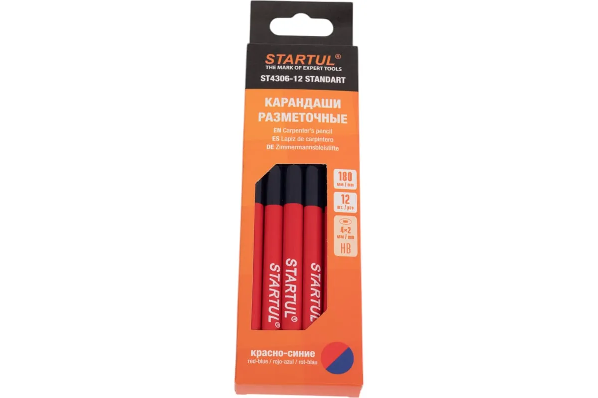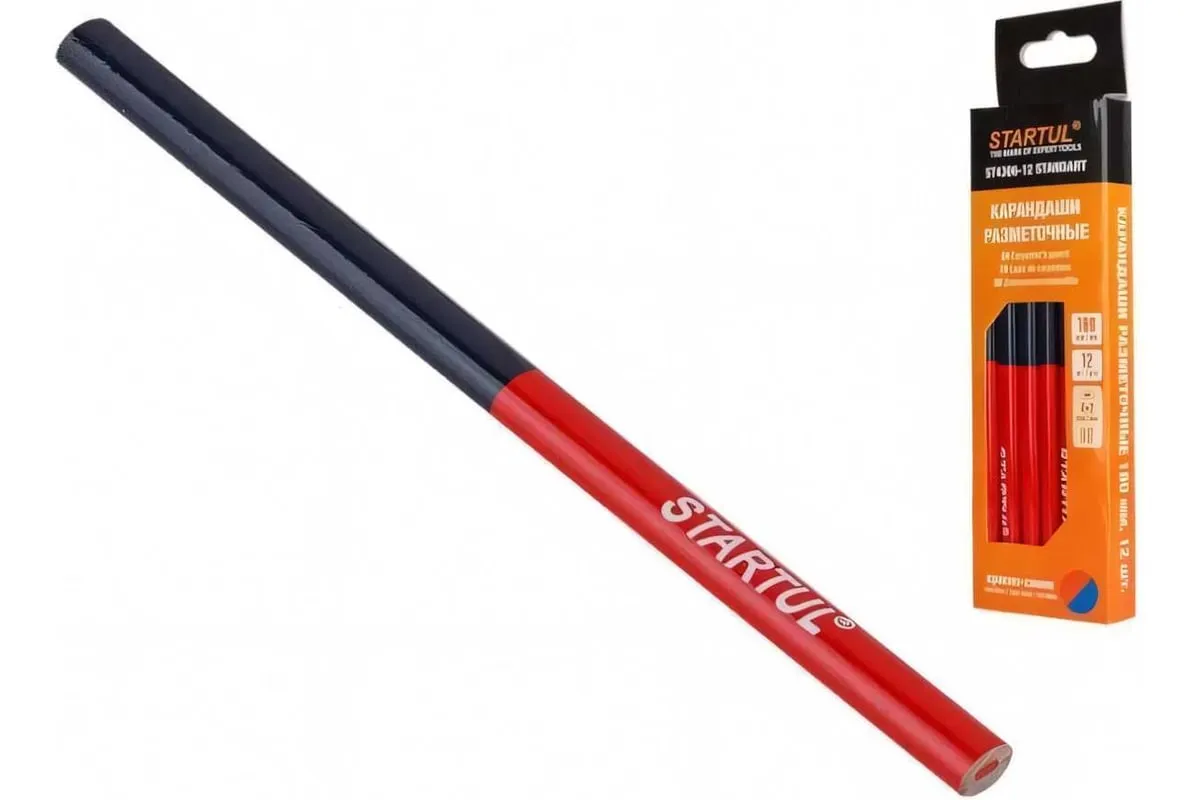 Разметочный карандаш STARTUL 180 мм двухцветный Standart 12 шт ST4306-12 подойдет для строительных, отделочных и ремонтных работ. Оставляет четкий след на кирпиче и бетоне, обоях и плотной бумаге. Легко заточить - можно без труда писать острием. Удобно держать в руках, а длина инструмента обеспечивает увеличенный срок службы.