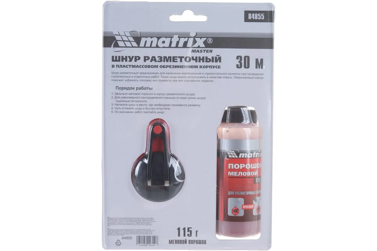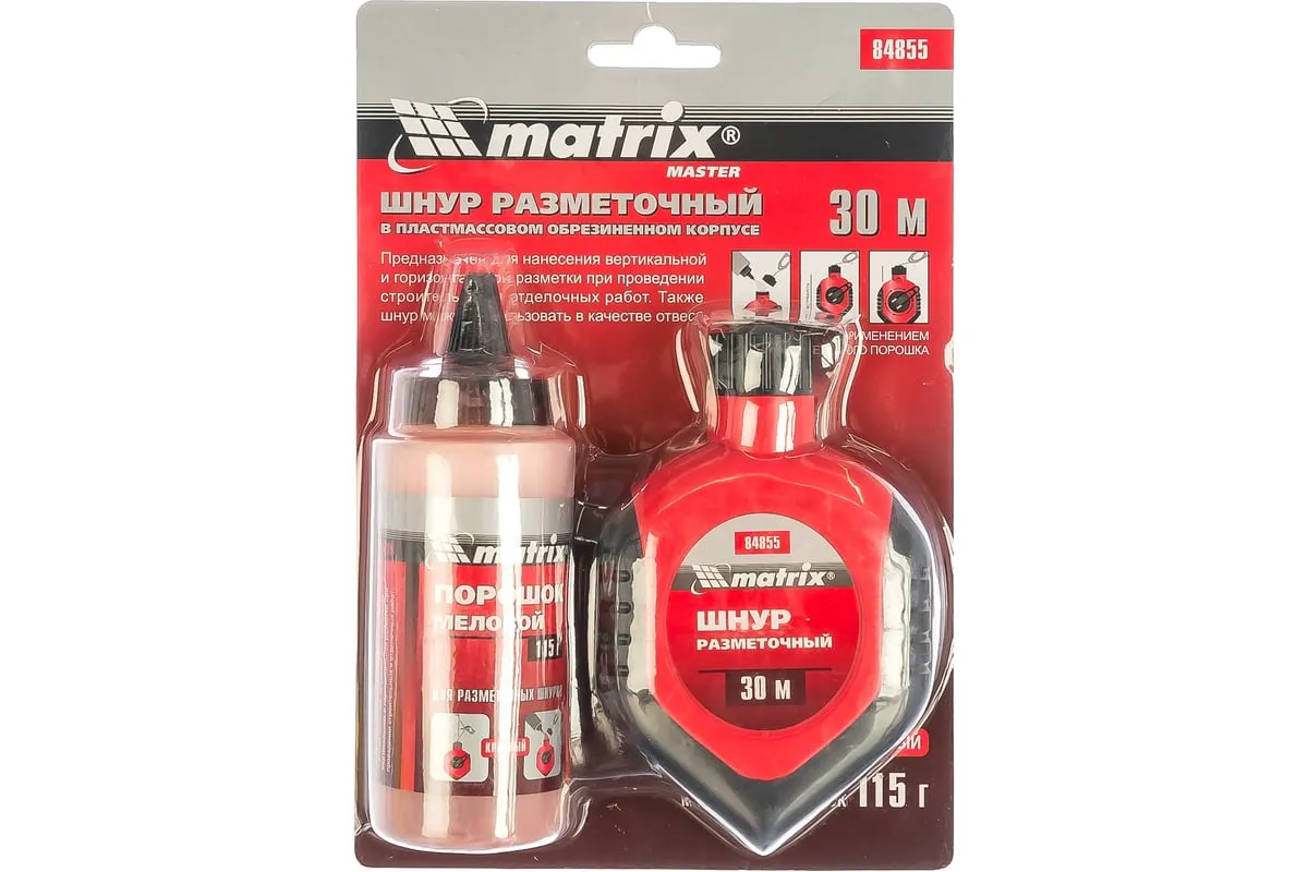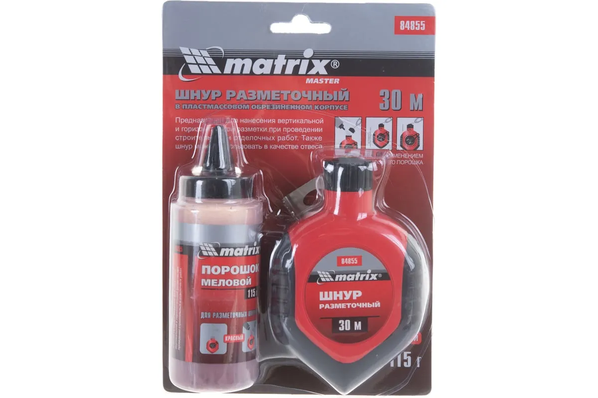Разметочный шнур Matrix 84855 в пластмассовом обрезиненном корпусе, поставляется с красным порошком и используется для построения прямых разметочных линий на горизонтальных и вертикальных поверхностях. Используется во время проведения строительных и ремонтно-отделочных работ.