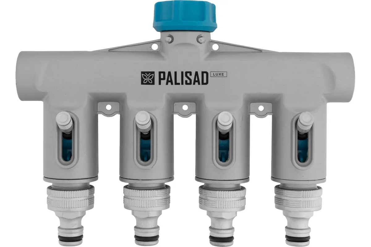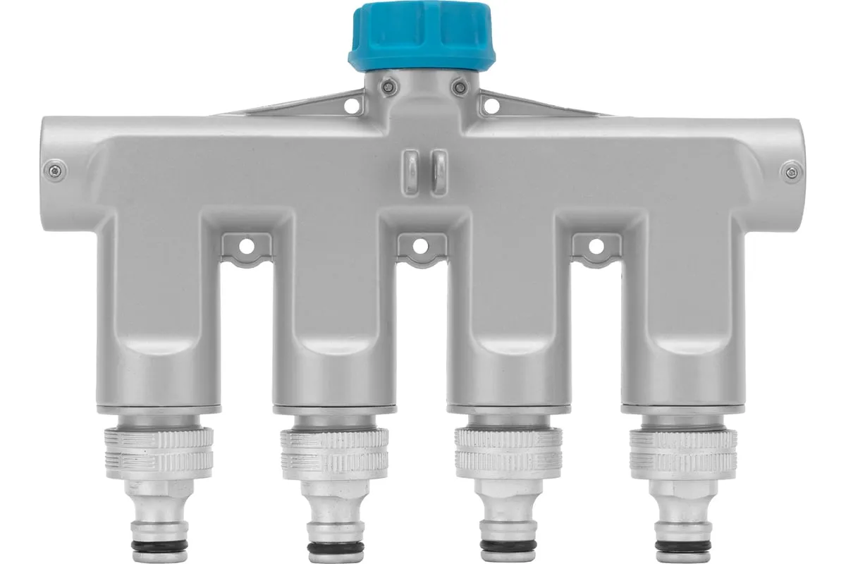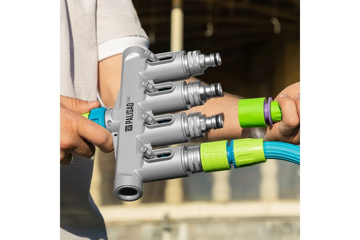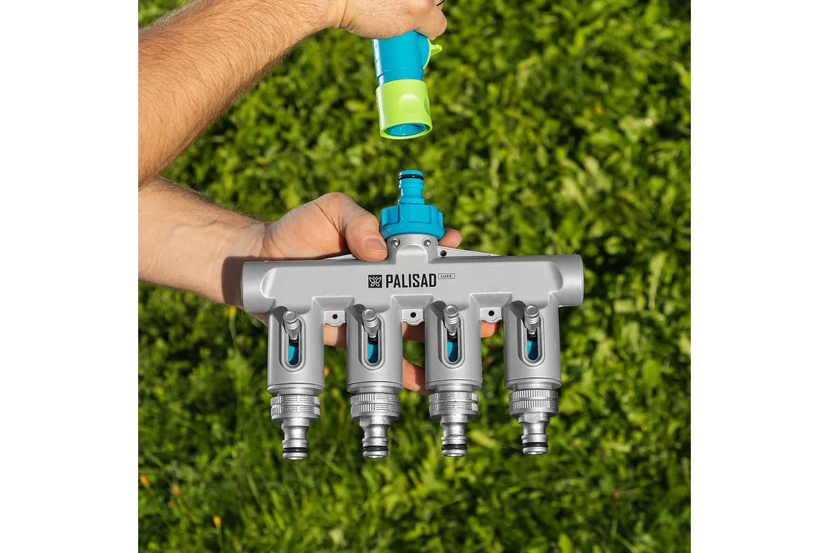 Четырехканальный штуцерный разветвитель Palisad LUXE 65833 с внутренней резьбой 3/4", из алюминия, предназначен для разделения водопроводной магистрали. Его устанавливают на магистральный отвод или резьбовой кран либо подключают к линии через адаптер. Соединяется со шлангами при помощи адаптеров. Поможет смонтировать надежную систему полива на дачном участке.