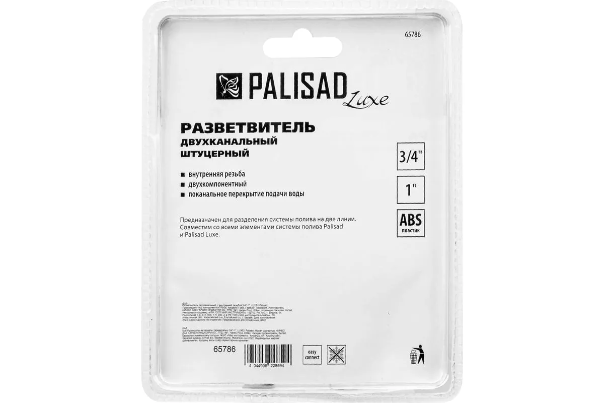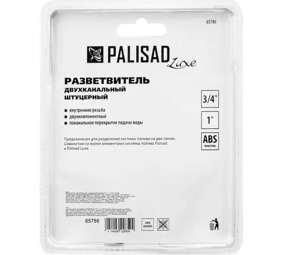 Двухканальный пластиковый разветвитель Palisad LUXE 65786 с внутренней резьбой позволяет подключить 2 водоразборные линии к крану или отводу с внешней резьбой 3/4"-1" дюйма. Будет полезен при монтаже поливочной системы на приусадебном участке.