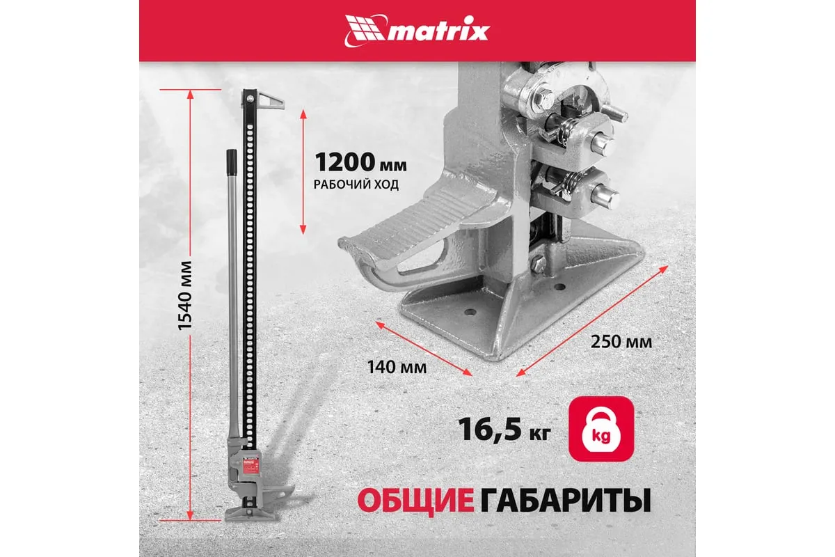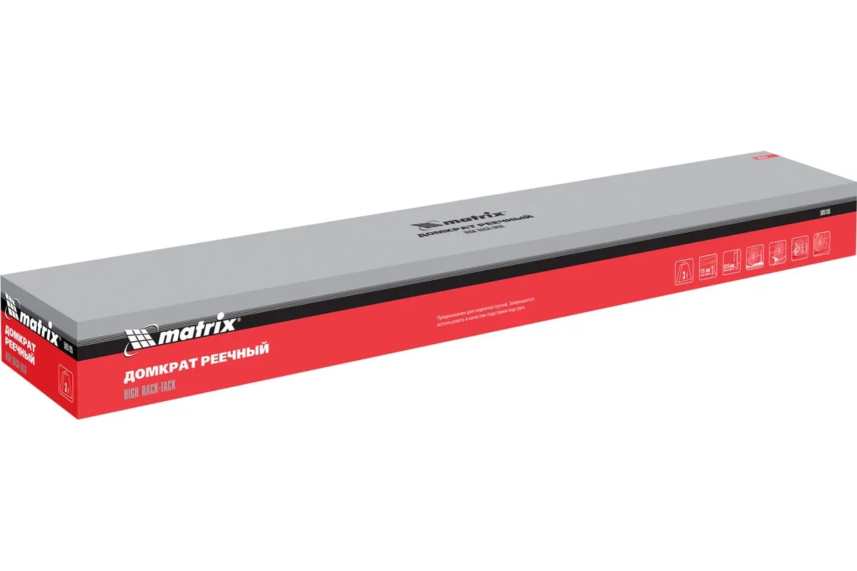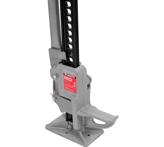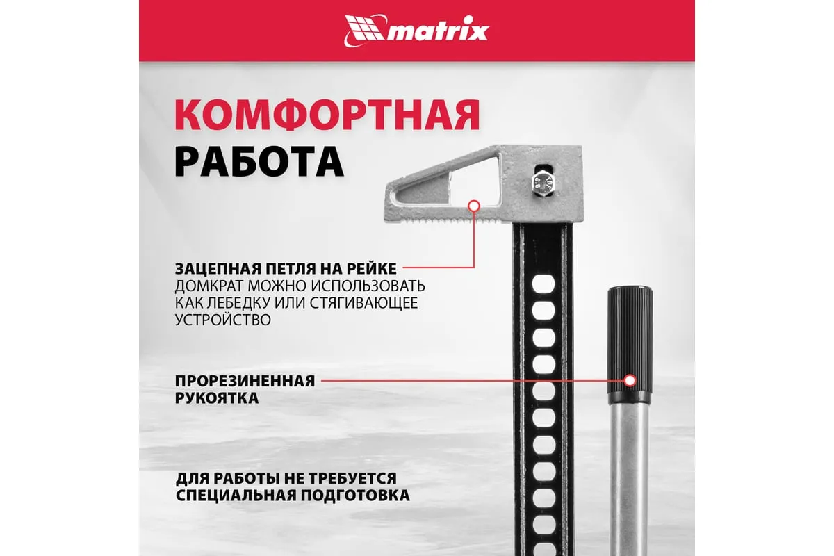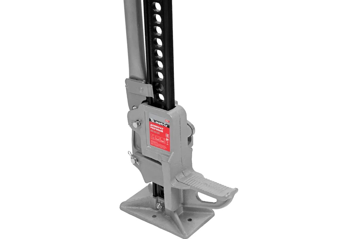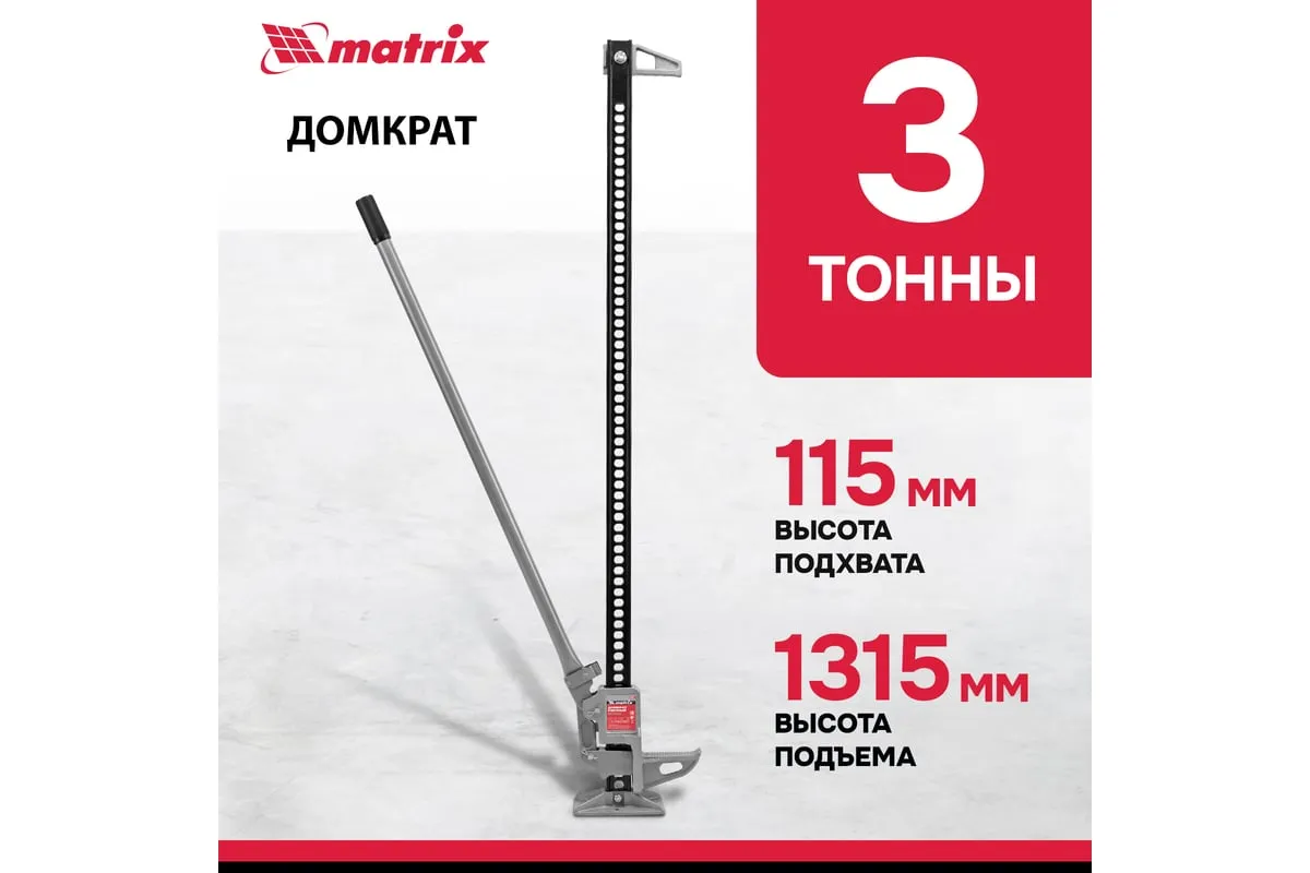 Реечный домкрат Matrix High Jack 505195 позволяет поднимать внедорожники и грузовики весом до 3 т на высоту 135-1315 мм. Пригодится во время ремонта автомобилей. Несущая рейка дополнена зацепной петлей, поэтому домкрат можно использовать как ручную лебедку или стягивающее устройство.