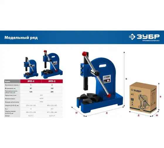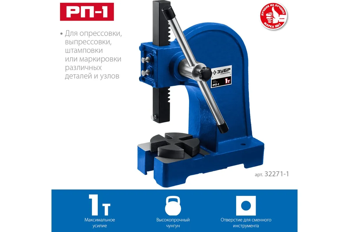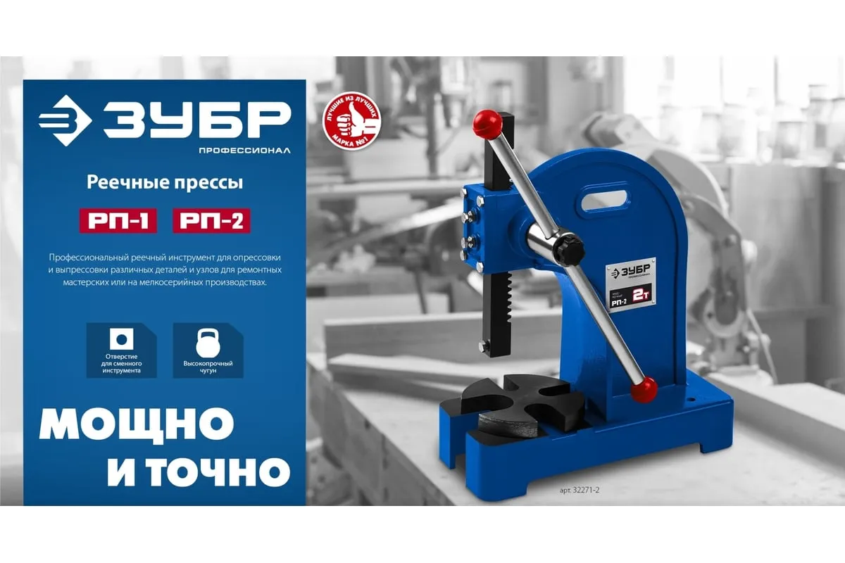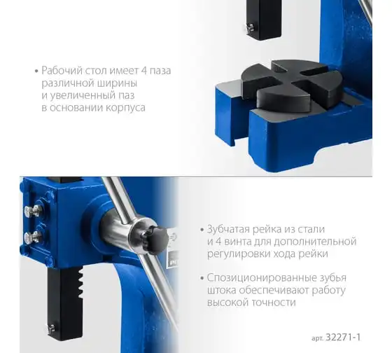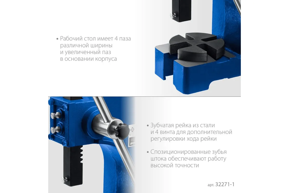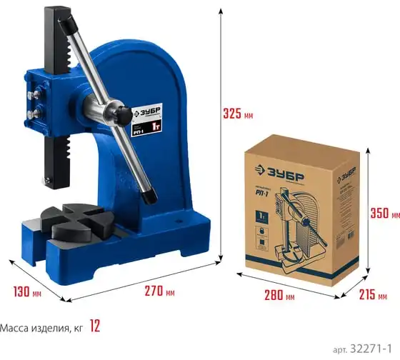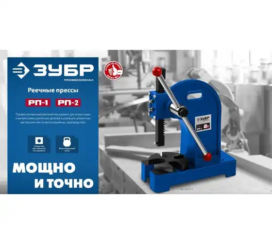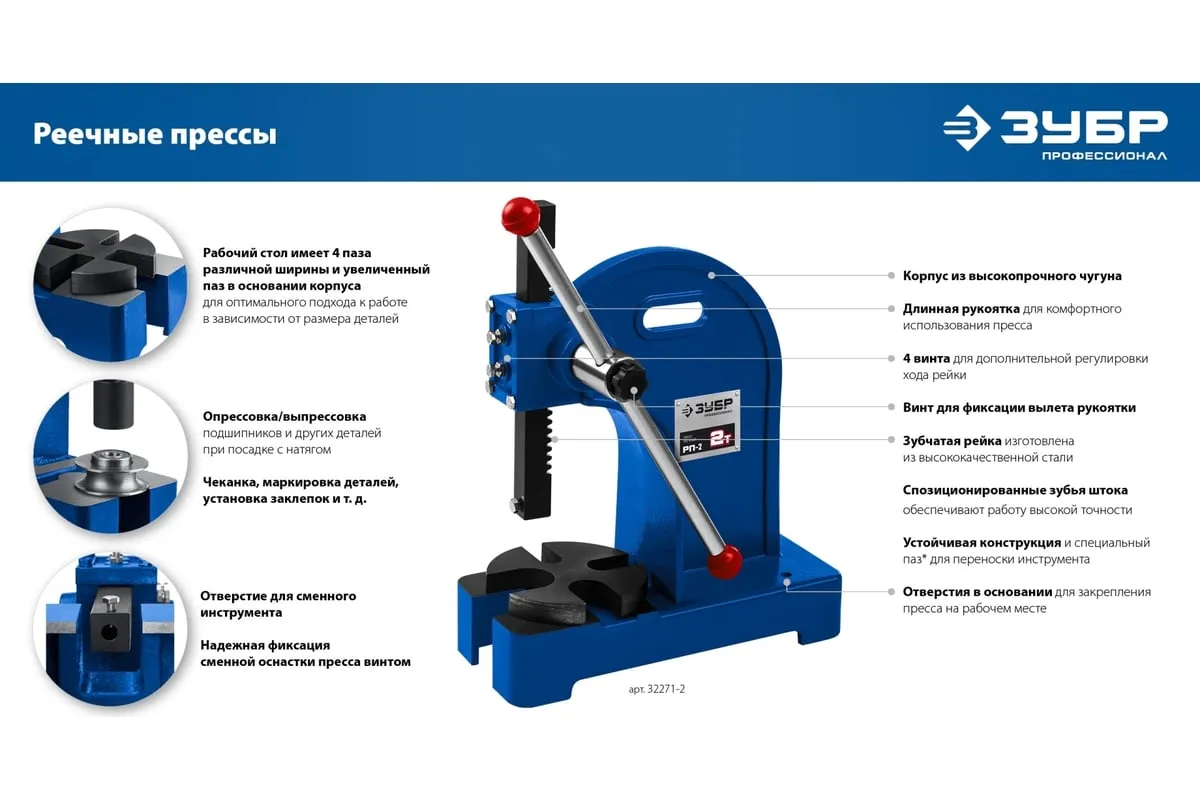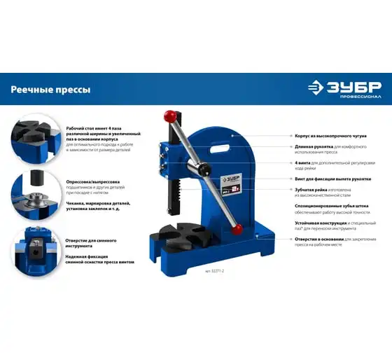 Реечный пресс ЗУБР РП-1 1 т 32271-1 предназначен для выпрессовывания подшипников, втулок и различных других деталей небольшой высоты. Высочайшая точность выполнения работы. Корпус из высокопрочный чугуна. Зубчатая рейка изготовлена из высококачественной стали. Рабочий стол имеет 4 паза различной ширины, позволяя выбрать оптимальный подход к работе в зависимости от детали.