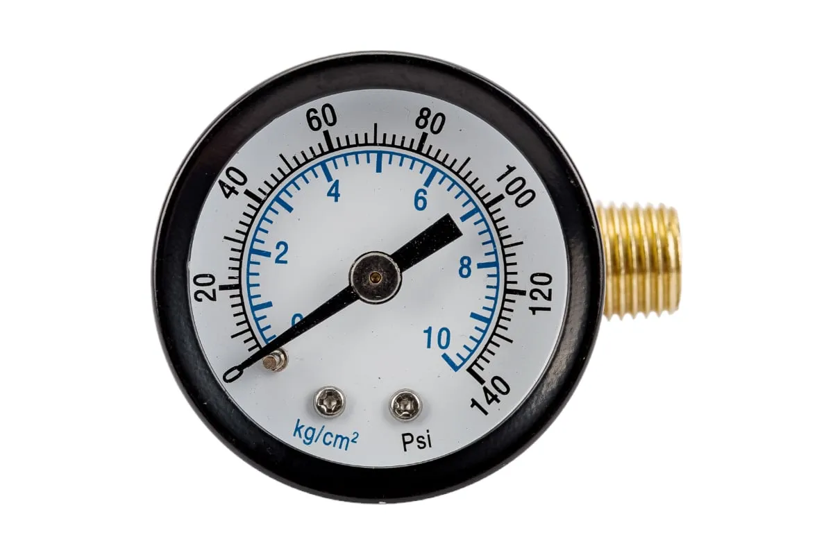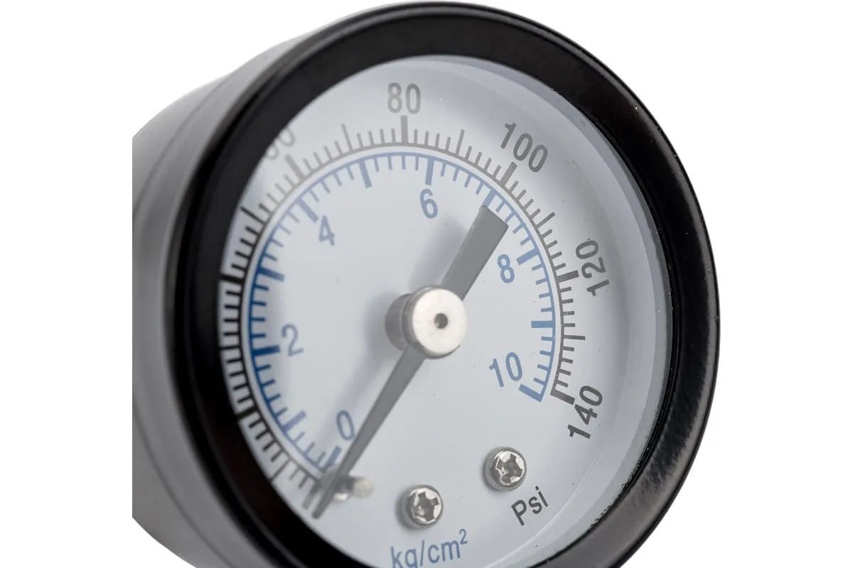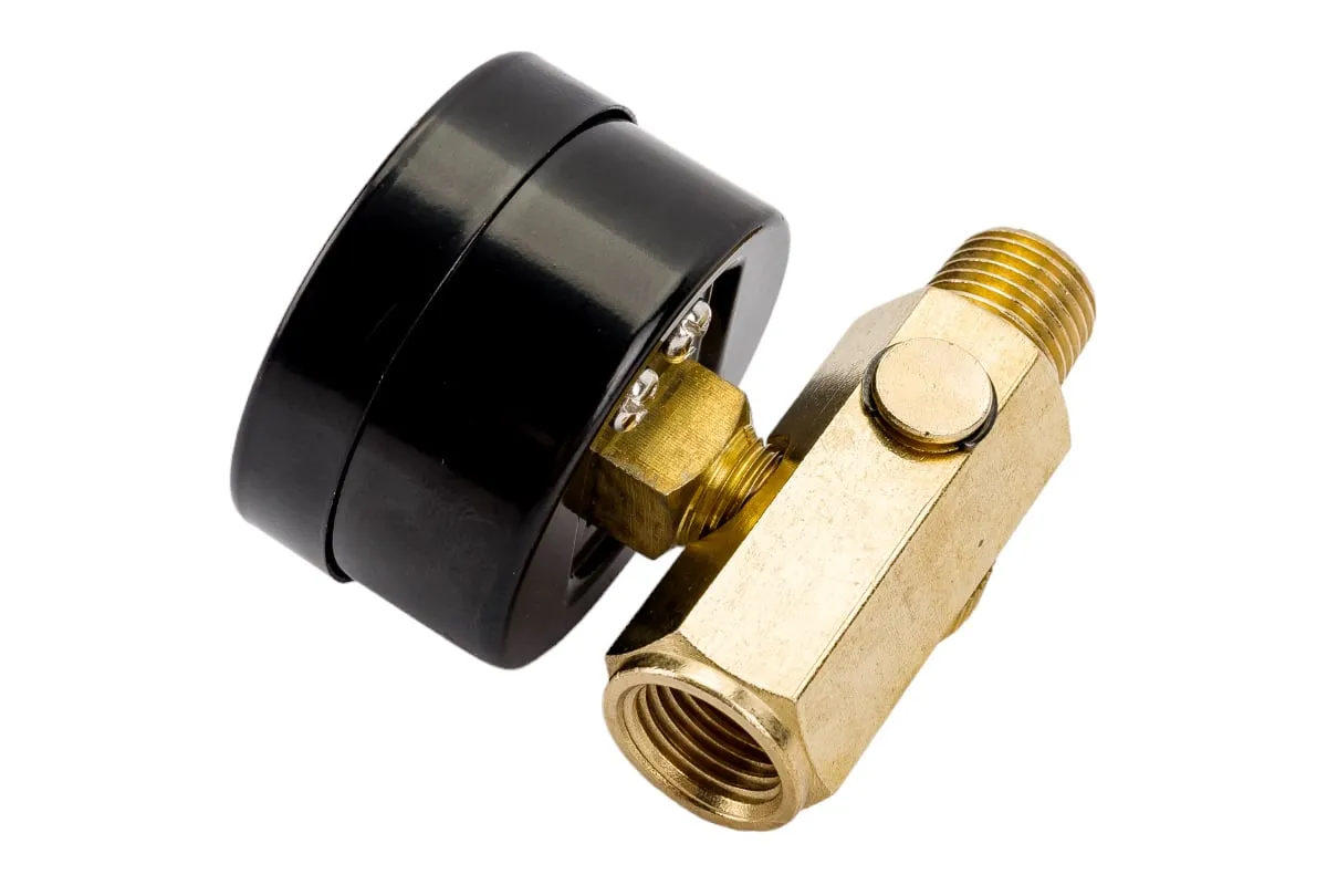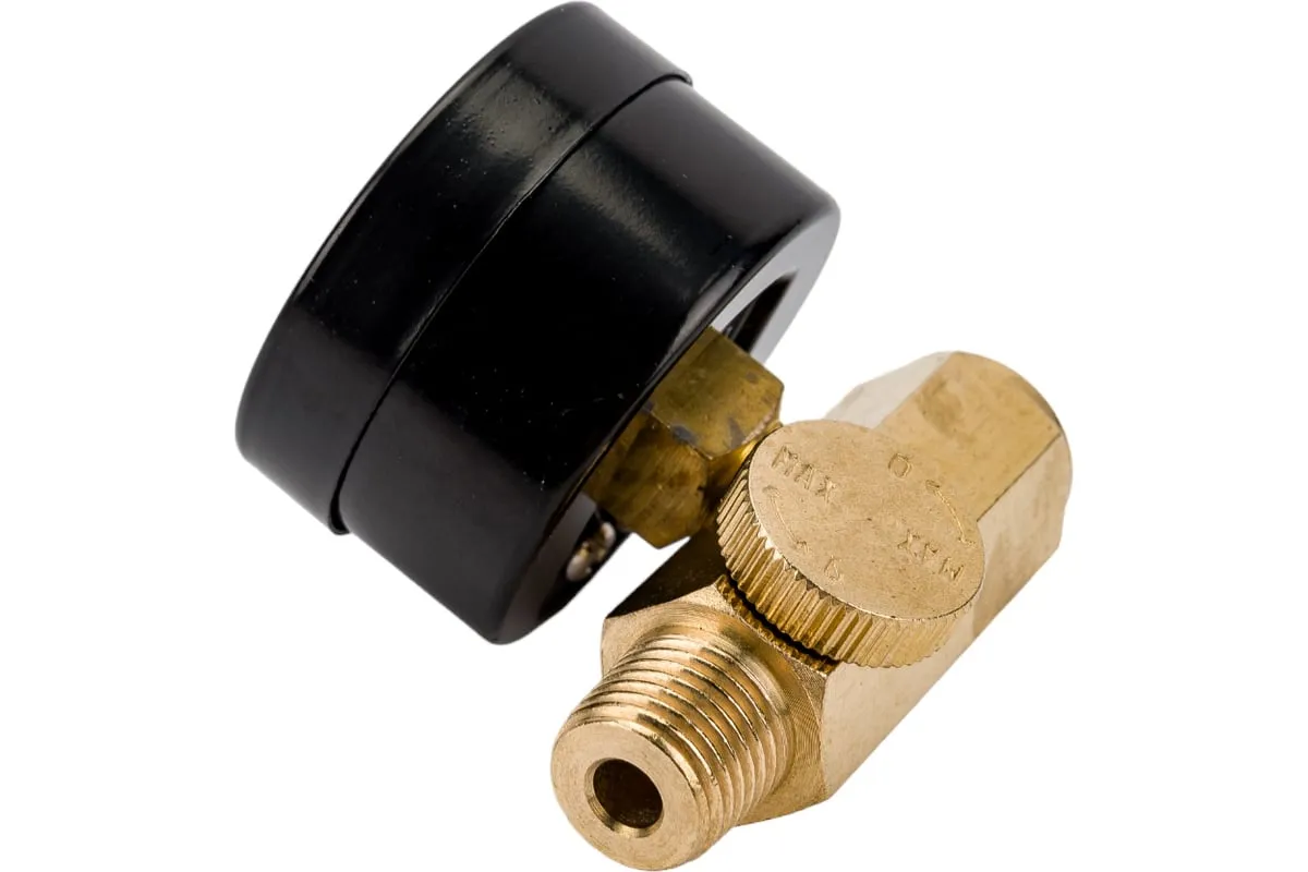 Компактное исполнение - для размещения прямо на пневмоинструменте. Регулирование давления происходит за счет изменения проходного сечения шаровым клапаном. Металлический корпус манометра - для прочности.