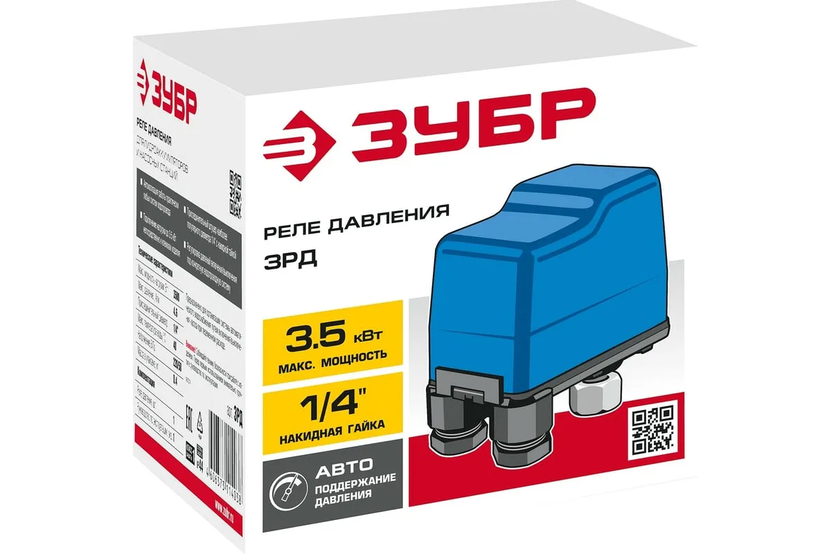 Реле давления Зубр ЗРД подходит для насосных станций ЗНАС и гидроаккумуляторов ЗГА. Необходимо для переоборудования любой системы водоснабжения на дачном участке в автоматическую. Легкое устройство отличается простотой и надежностью. Помогает экономить воду и электричество. Нагрузка подключает сразу к клеммам 1 или 3-х фазных насосов. При большой нагрузке возможна установка дополнительного реле.Гарантия 5 лет.Характеристики: